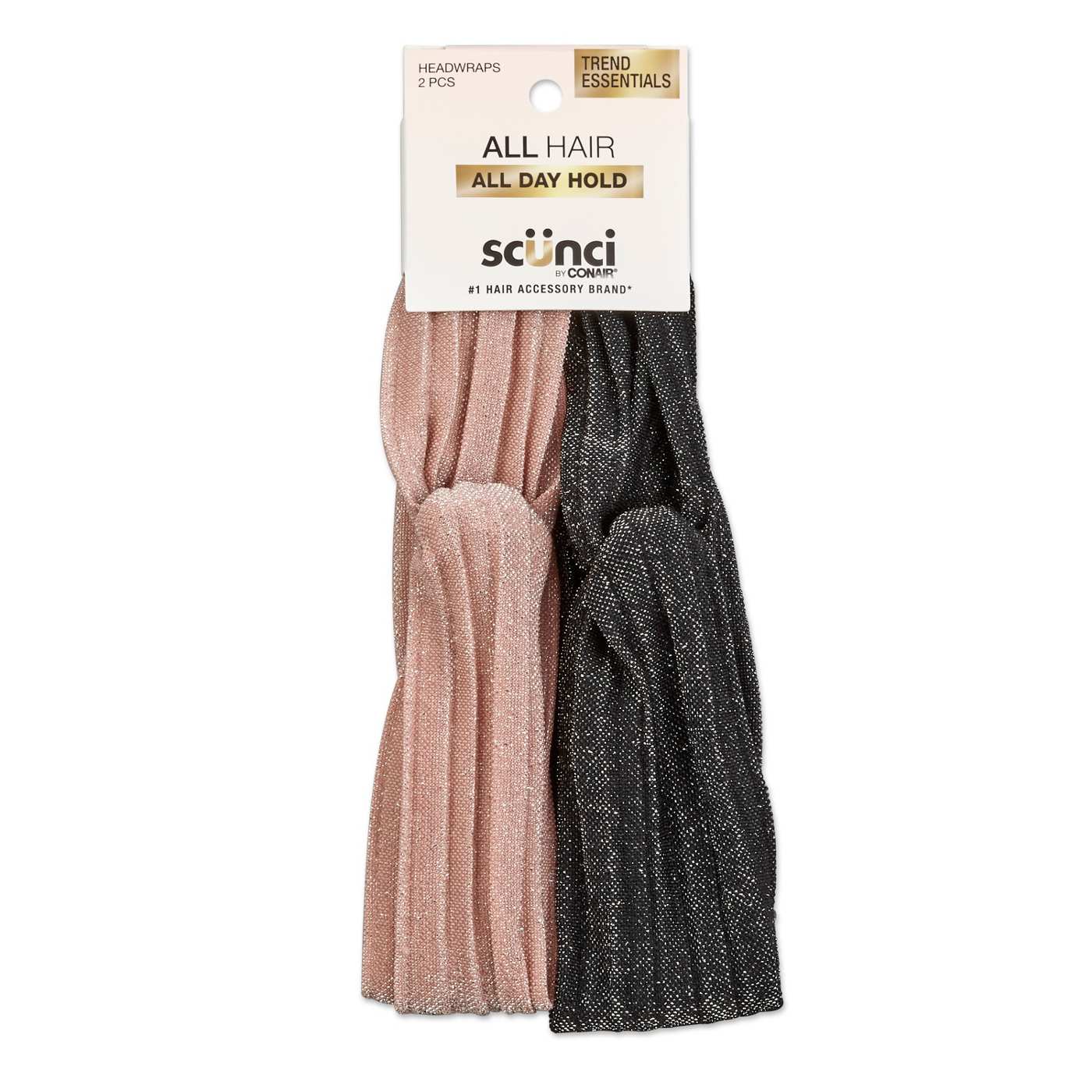 This two-pack of Scunci knotted headwraps offers a fashionable way to accessorize. The set includes one headwrap in a shimmery rose gold fabric and another in a shimmery black ribbed material. These versatile accessories provide a comfortable fit for creating a variety of stylish looks.• Soft, flexible fabric provides a pressure-free, comfortable fit• Wide band design helps keep hair neatly away from the face• Knotted detail creates a stylish focal point