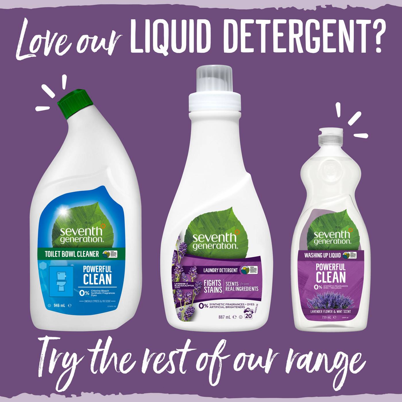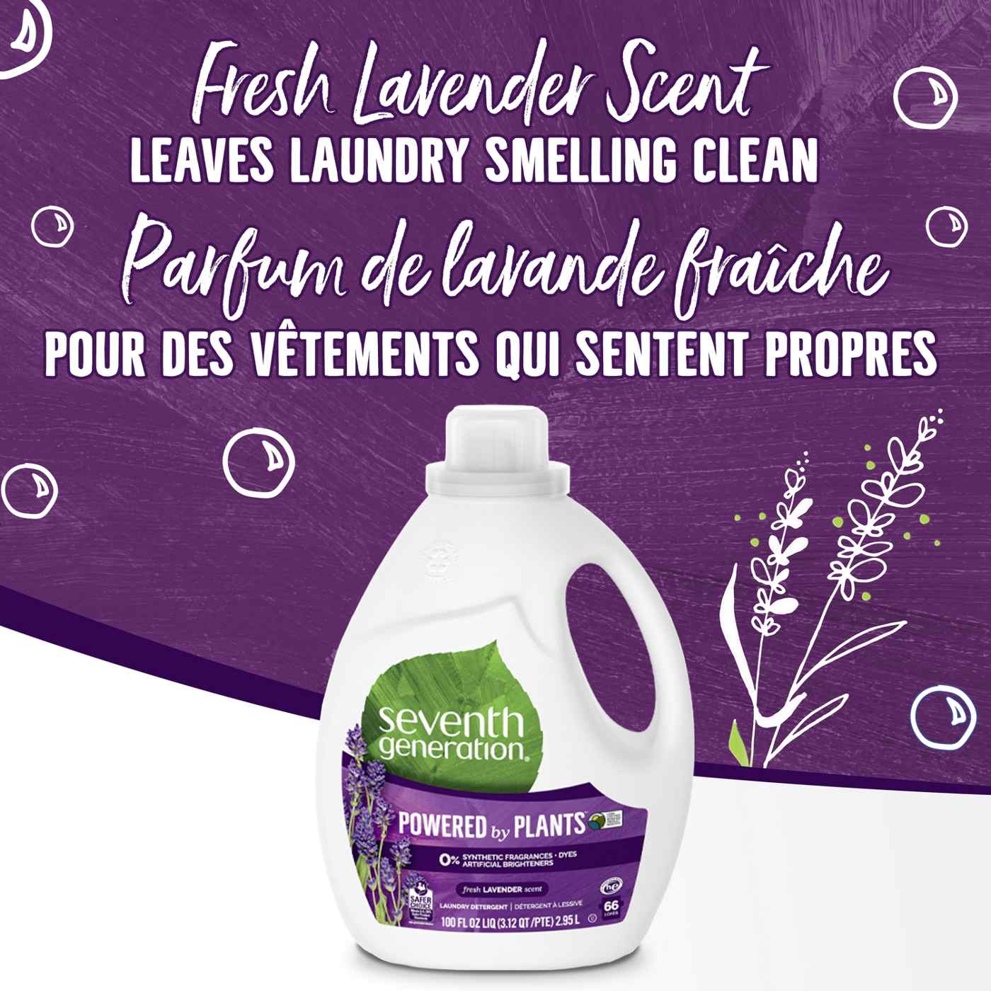Seventh Generation Laundry Detergent is tough on stains but gentle to your world. With no dyes, artificial brighteners or synthetic fragrances, our laundry detergent liquid gives you great results in HE and standard machines and works in all water temperatures. The Fresh Lavender scent is derived from 100% essential oils and botanical extracts, leaving your laundry fresh and clean without harsh chemicals. For more than 25 years, Seventh Generation has been thoughtfully formulating safe and effective plant-based products that work. Really well. You may also notice a cute Leaping Bunny seal on our products. That means we never test our products on animals and our products do not contain animal-based ingredients. We design our products to be safe for people, their homes, and the environment. By choosing Seventh Generation washing detergent and dryer sheets products, you're joining us in nurturing the health of the next seven generations.