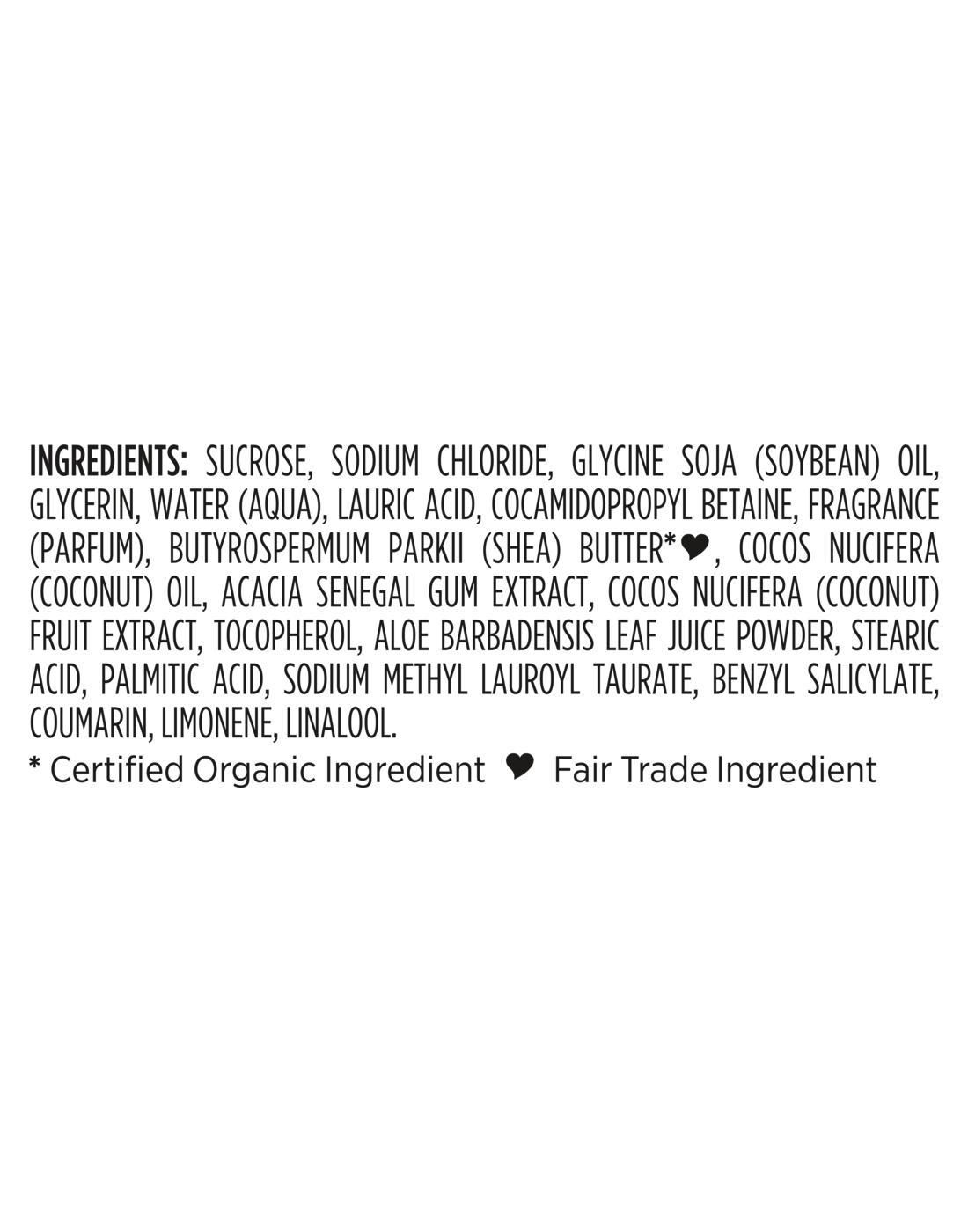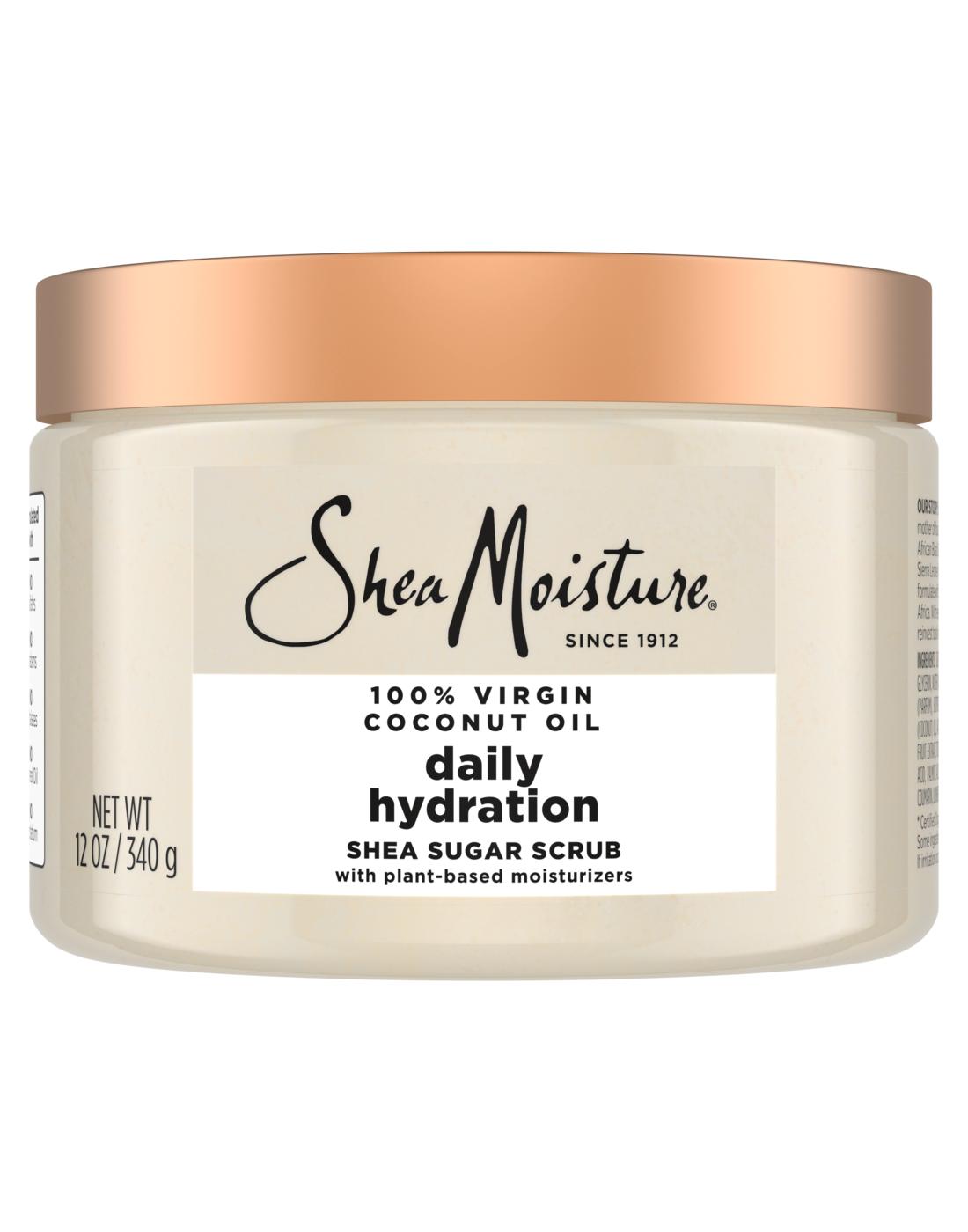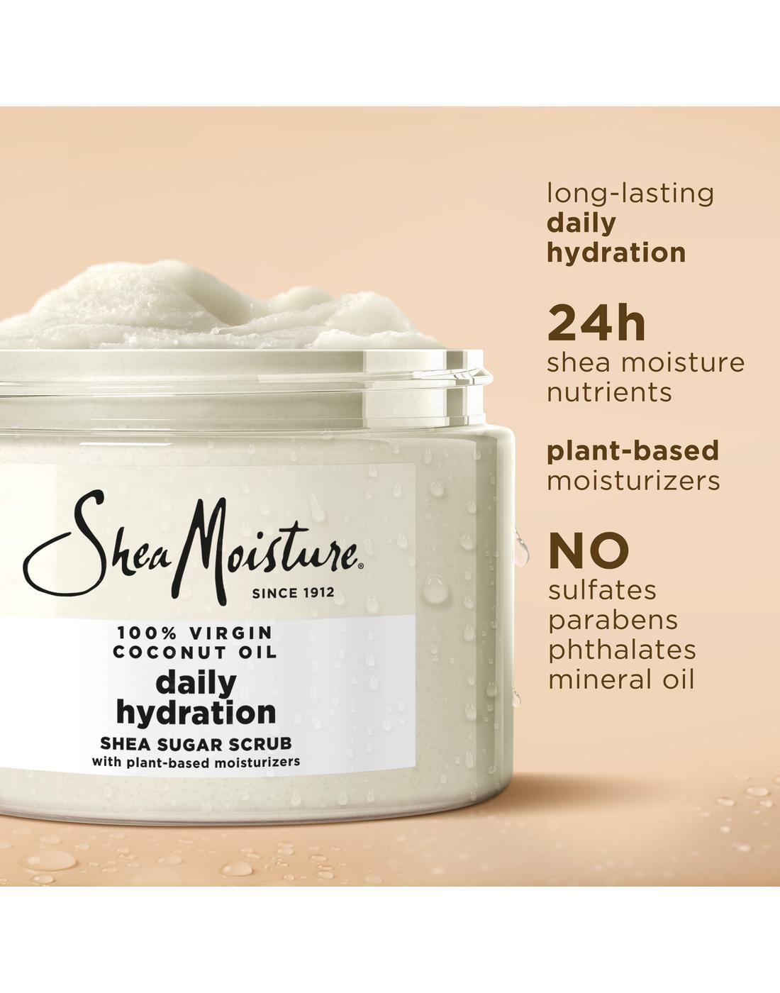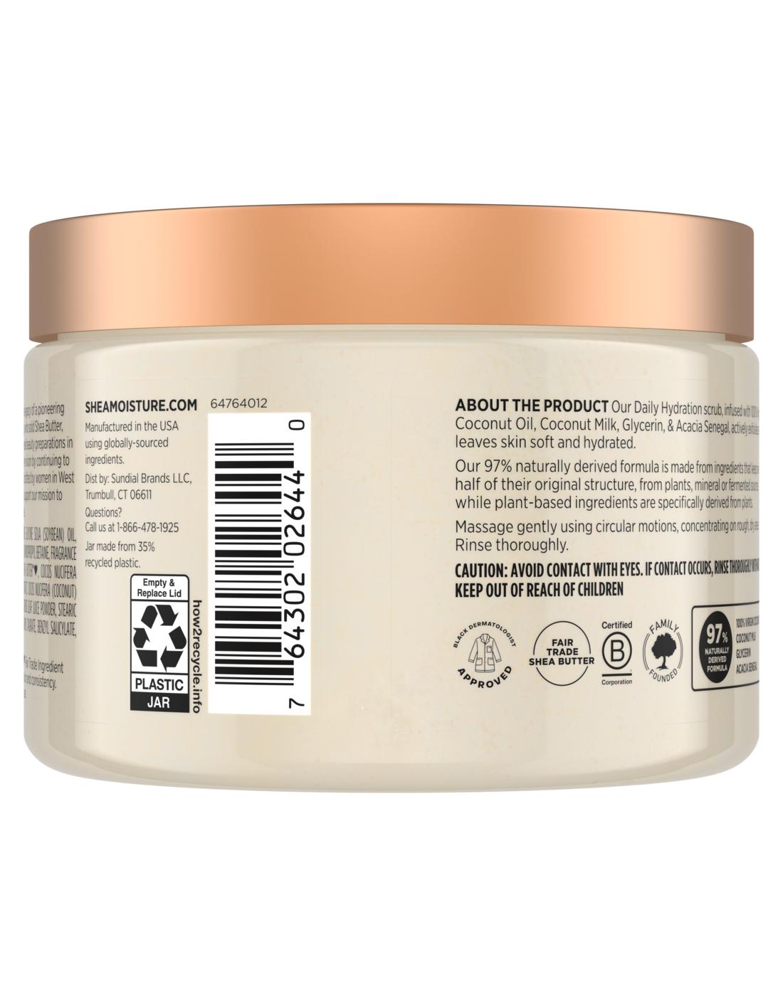 Our new 100% Virgin Coconut Oil Daily Hydration Body scrub is designed specifically for melanin-rich skin. Infused with 100% Virgin Coconut Oil, Coconut Milk, Glycerin & Acacia Senegal, this Body scrub works to nourish and replenish skin, leaving it feeling soft and smooth. Our moisturizing body scrub is formulated with fair trade Shea Butter. Our formula provides 24H of Shea Moisture nutrients and is formulated with plant-based moisturizers. This Body scrub is 97% naturally derived and free from sulfates, parabens, phthalates, mineral oil, and petrolatum. For best results, use this Body scrub in combination with other products from SheaMoisture's 100% Virgin Coconut Oil Collection.•SheaMoisture's 100% Virgin Coconut Oil Daily Hydration body scrub, designed for melanin-rich skin, replenishes and restores skin for 24 hours.•Infused with 100% Virgin Coconut Oil, Coconut Milk, Glycerin & Acacia Senegal, this Body scrub gently cleanses and helps nourish and replenish skin.•Made with fair trade shea butter and 97% naturally derived ingredients, this Body scrub is free from sulfates, parabens, phthalates, mineral oil, and petrolatum.•Upon use, skin feels calm and smooth.•For best results, use in combination with other products from SheaMoisture's 100% Virgin Coconut Oil Collection.