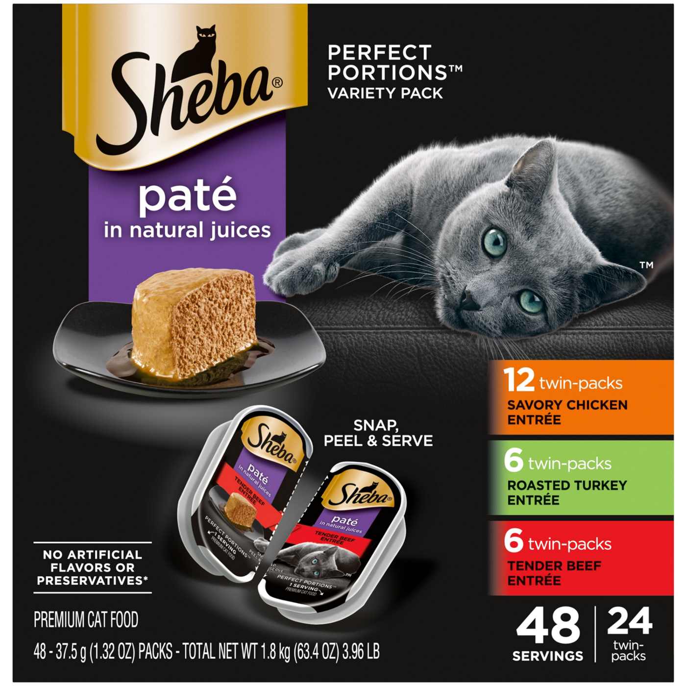 Contains twenty-four (24) PERFECT PORTIONS twin pack trays (48 servings total) of SHEBA Wet Cat Food Pate Variety Pack: (12) Savory Chicken Entree, (6) Roasted Turkey Entree, (6) Tender Beef Entree