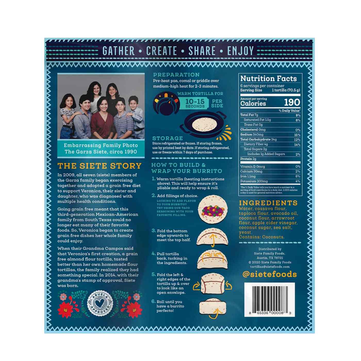 In 2009, all seven (siete) members of the Garza family began exercising together and adopted a grain-free diet to support Veronica, their sister and daughter, who was diagnosed with multiple health conditions. Going grain-free meant that this third-generation Mexican-American family from South Texas could no longer eat many of their favorite foods. So, Veronica began to create grain-free dishes her whole family could enjoy. When their Grandma Campos said that Veronica's first creation, a grain-free almond flour tortilla, tasted better than her own homemade flour tortillas, the family realized they had something special. In 2014, with their grandma's stamp of approval, Siete was born.