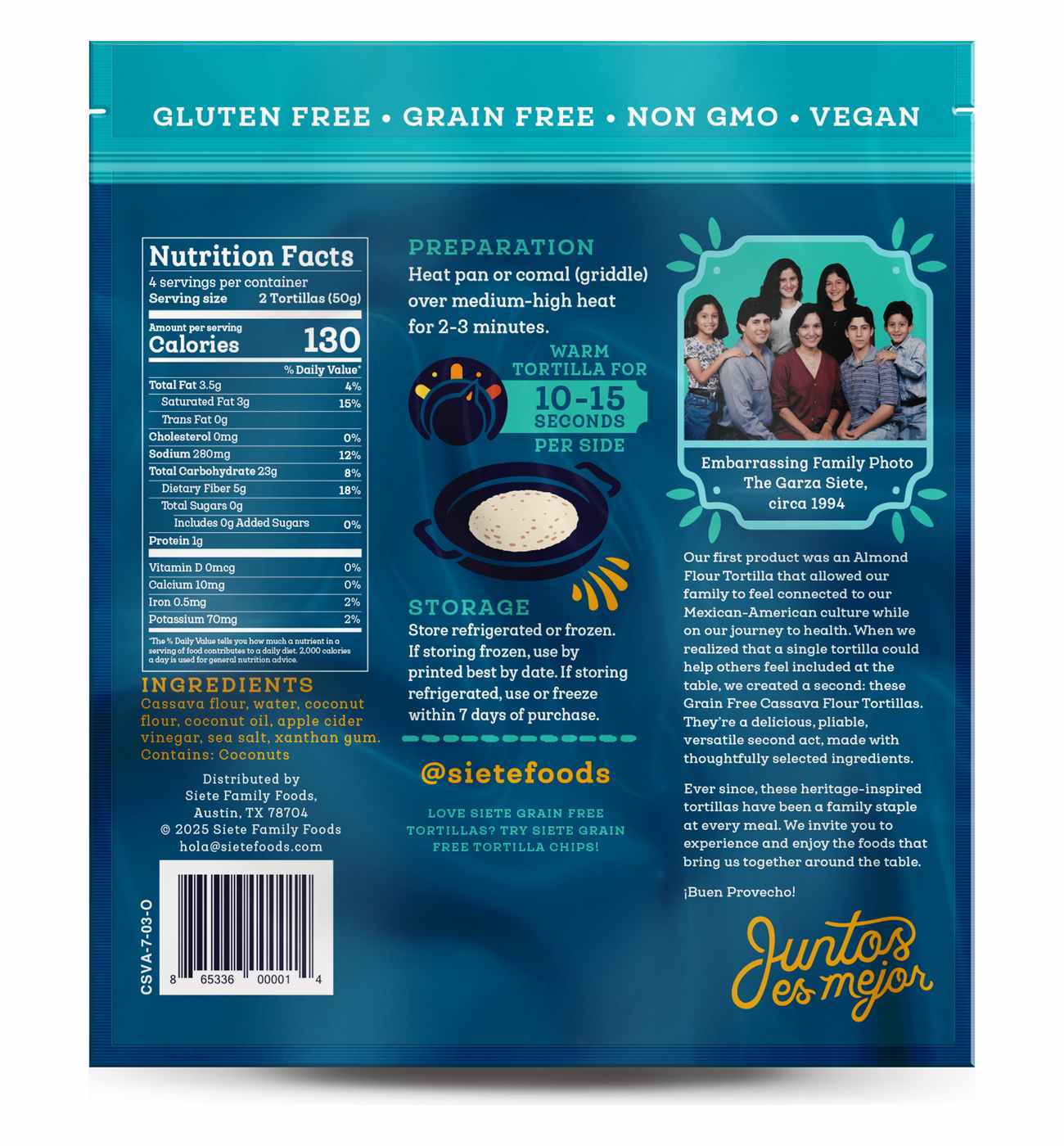 In 2009, all seven (siete) members of the Garza family began exercising together and adopted a grain-free diet to support Veronica, their sister and daughter, who was diagnosed with multiple health conditions. Going grain-free meant that this third-generation Mexican-American family from South Texas could no longer eat many of their favorite foods. So, Veronica began to create grain-free dishes her whole family could enjoy. When their Grandma Campos said that Veronica's first creation, a grain-free almond flour tortilla, tasted better than her own homemade flour tortillas, the family realized they had something special. In 2014, with their grandma's stamp of approval, Siete was born.