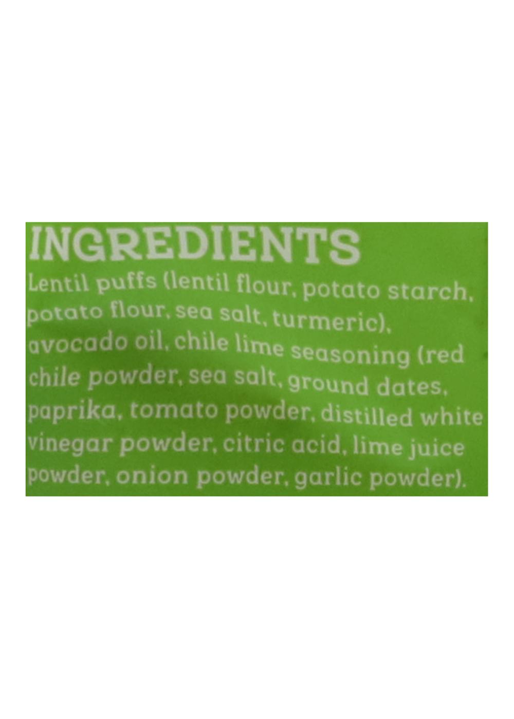 Lentil Puffs (Lentil Flour, Potato Starch, Potato Flour, Sea Salt, Turmeric), Avocado Oil, Chile Lime Seasoning (Red Chile Powder, Sea Salt, Ground Dates, Paprika, Tomato Powder, Distilled White Vinegar Powder, Citric Acid, Lime Juice Powder, Onion Powder, Garlic Powder).