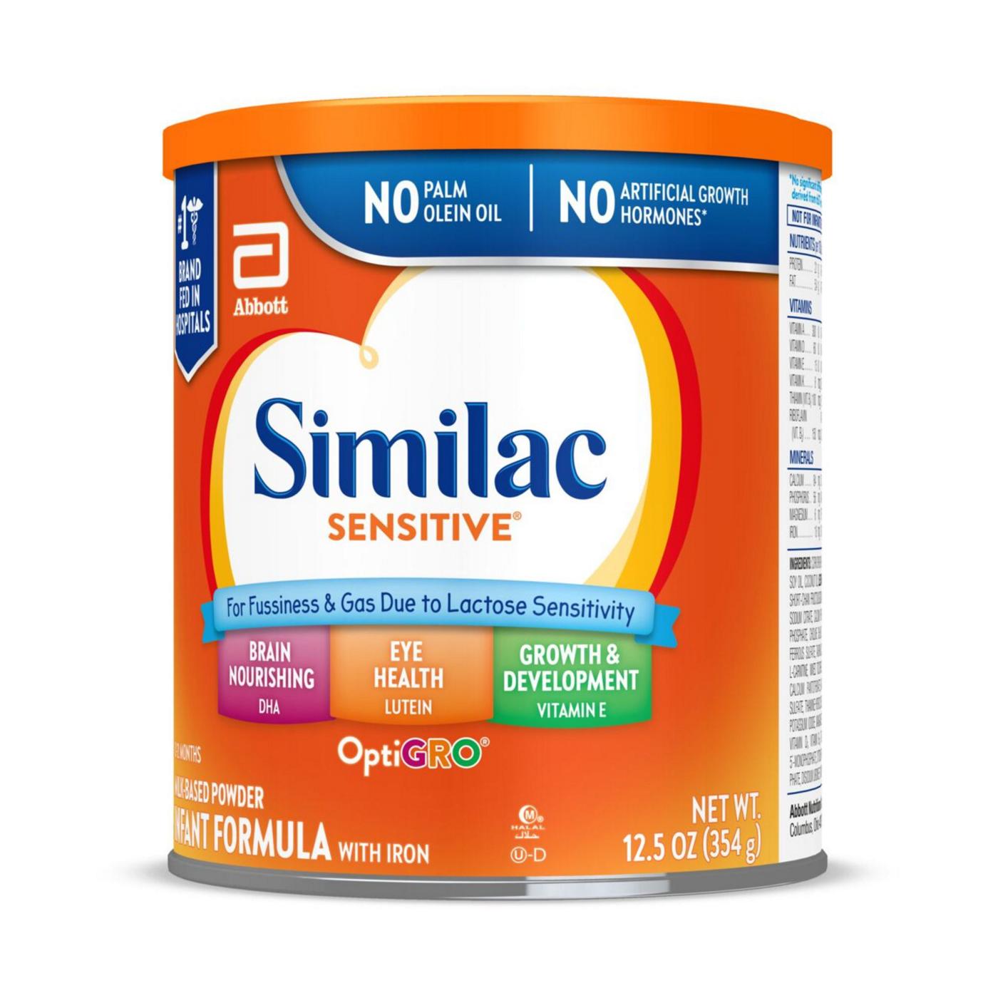 Similac Sensitive is an easy-to-digest, milk-based infant formula designed for sensitive tummies. It’s complete nutrition for fussiness, gas, or mild spit-up. Our formula has our exclusive blend of nutrients to help support baby’s brain and eye development. Similac was the first leading infant formula brand with no artificial growth hormones.