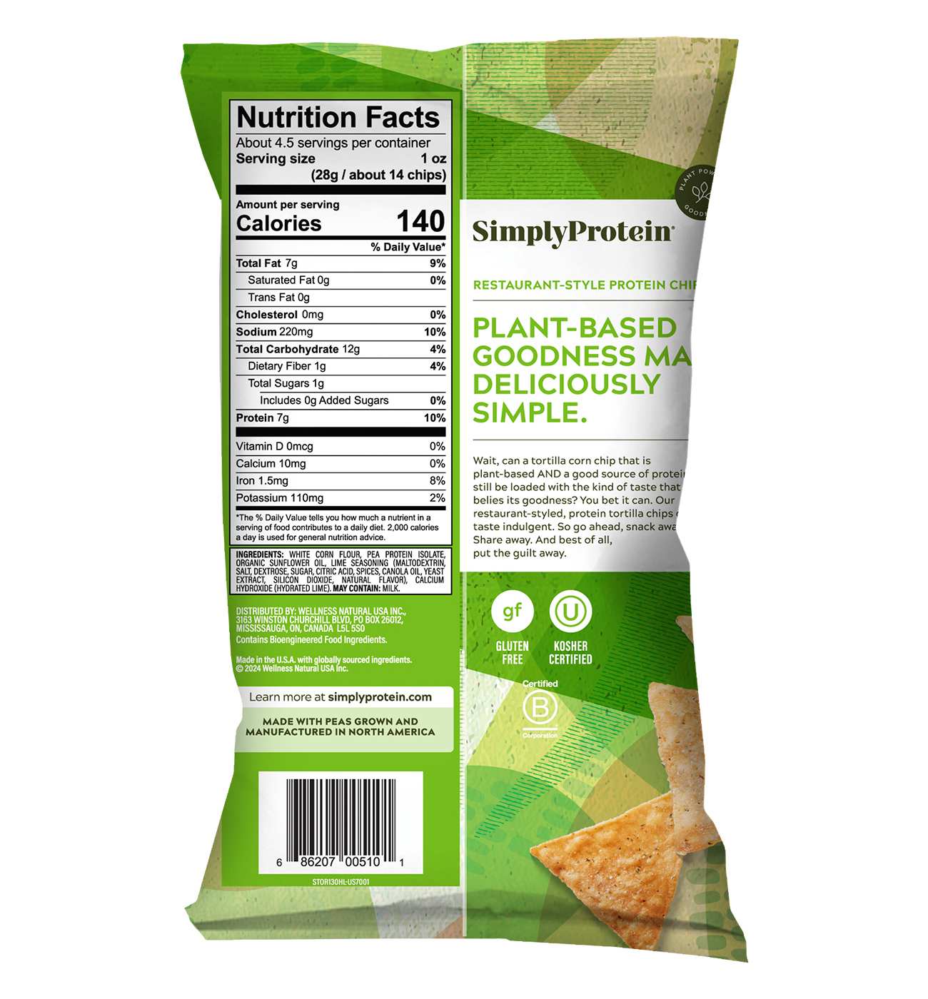Delicious restaurant-style protein chip seasoned to perfection with 7g of protein; a great dip chip to be enjoyed with salsa, guac or on its own. A fantastic tasting corn tortilla chip that is plant-based and a good source of protein. Our craveable restaurant-styled protein tortilla chip even has 7g of North American grown pea protein per serving. They are also Gluten-Free and made with organic Sunflower oil. Enjoy our Hint of Lime flavored chip, which adds the fresh and citrusy flavor of a juicy lime, with a bit of salt. Perfect for a snack, side for a meal, or night-time treat. So go ahead, snack away. Share away. And best of all, put the guilt away.