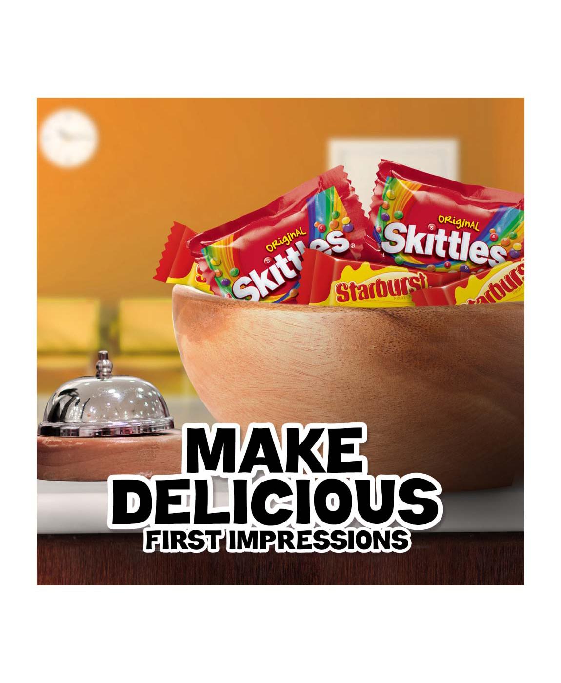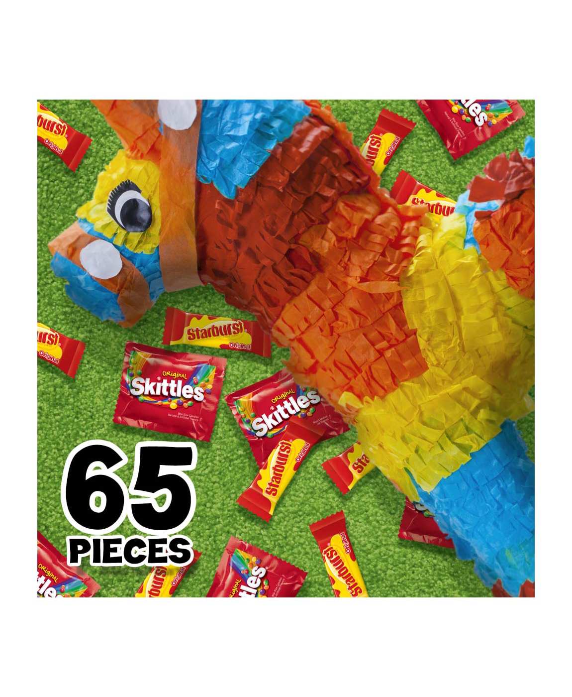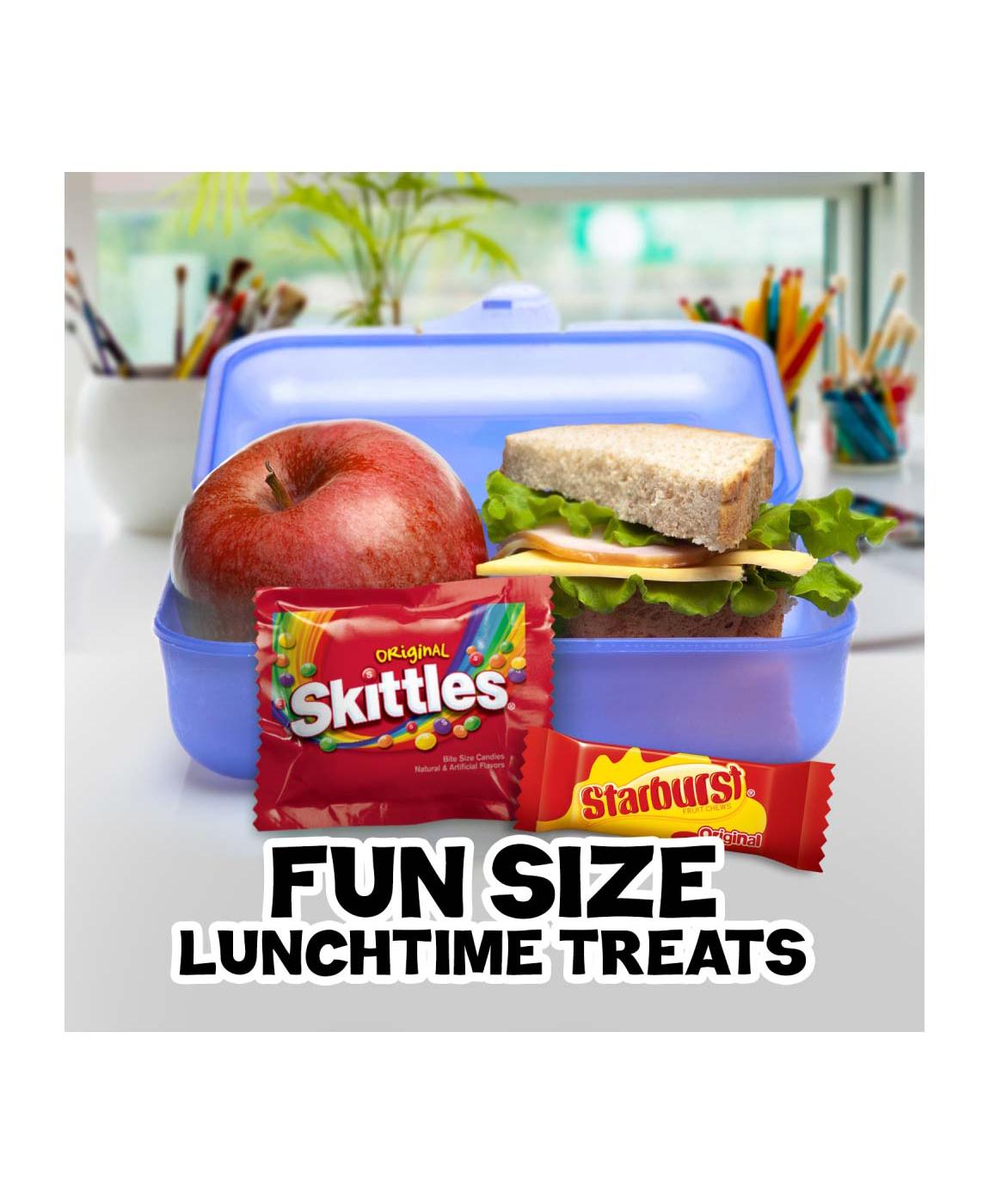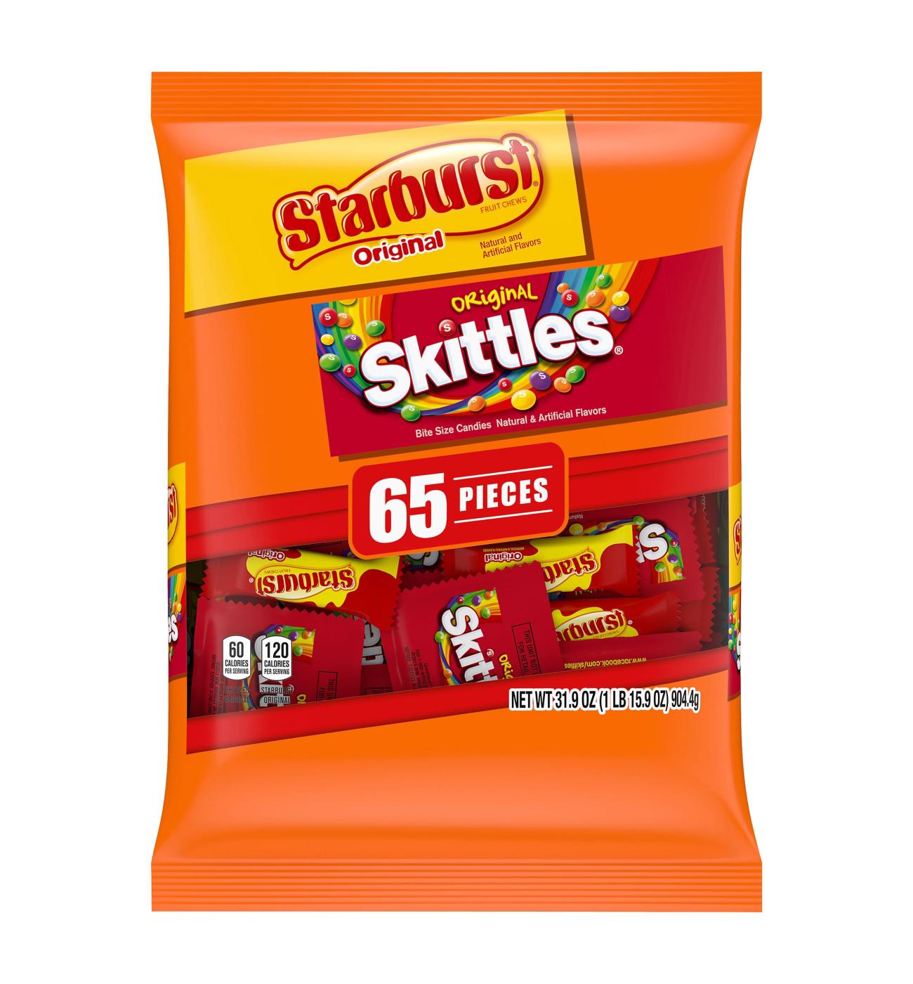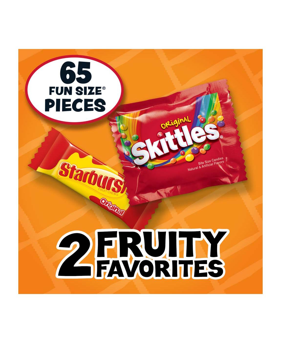 Enjoy a variety of fruity flavors with this SKITTLES & STARBURST Chewy Candy Fun Size Variety Mix. Each bag contains a mixture of SKITTLES Original Candy and STARBURST Original Candy flavors. This 31.9-oz. assorted candy mix has delicious fruity candy for stocking the office pantry or packing in your family's lunches. Fruity, chewy and loved by all, keep everyone's favorite colorful candies on hand with this assortment of SKITTLES & STARBURST Chewy Candies.-Contains one (1) 31.9-ounce assorted candy bag of SKITTLES Original and STARBURST Original Chewy Candy-This 65-piece bulk candy pack includes Fun Size SKITTLES Original and STARBURST Original chewy candies-Individually wrapped fun size packs of SKITTLES Original bite-size chewy candies and STARBURST Original Fruit Chews-Perfect for parties, gift bags, Easter, Christmas, Valentine's Day, and Halloween or as an everyday treat-Two kinds of candies in one bag