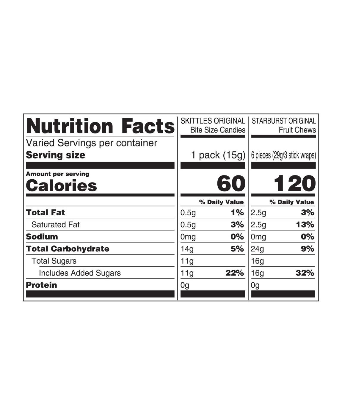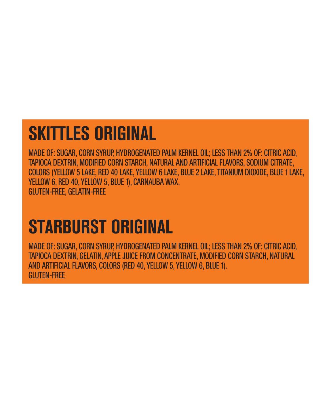 Skittles Original: Made of: Sugar, Corn Syrup, Hydrogenated Palm Kernel Oil; Less than 2% of: Citric Acid, Tapioca Dextrin, Modified Corn Starch, Natural and Artificial Flavors, Sodium Citrate, Colors (Yellow 5 Lake, Red 40 Lake, Yellow 6 Lake, Blue 2 Lake, Titanium Dioxide, Blue 1 Lake, Yellow 6, Red 40, Yellow 5, Blue 1), Carnauba Wax. Starburst Original: Made of: Sugar, Corn Syrup, Hydrogenated Palm Kernel Oil; Less than 2% of: Citric Acid, Tapioca Dextrin, Gelatin, Apple Juice from Concentrate, Modified Corn Starch, Natural and Artificial Flavors, Colors (Red 40, Yellow 5, Yellow 6, Blue 1).