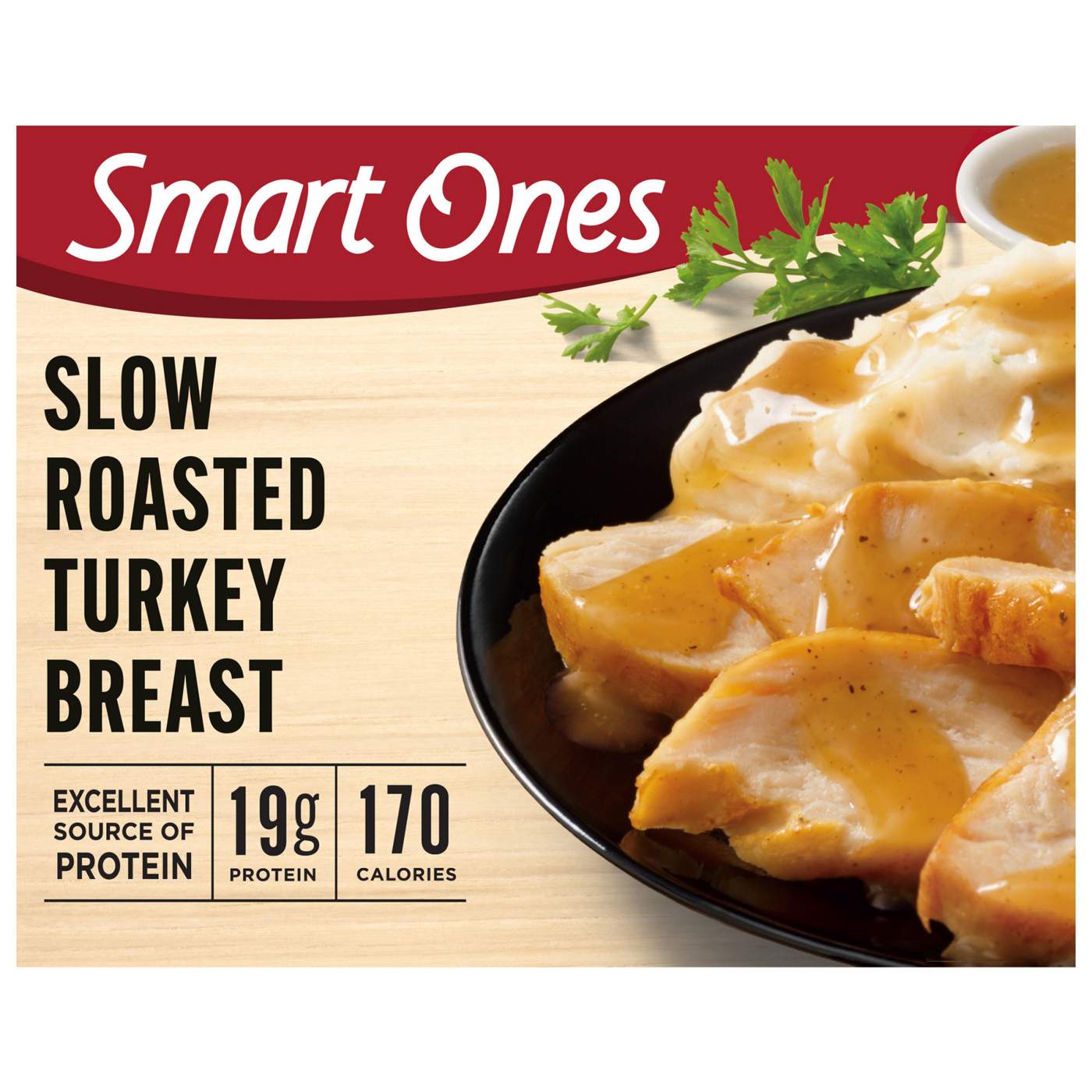 The easy way to make deliciously smart choices. When it's time to think about lunch or dinner, Smart Ones Slow Roasted Turkey Breast offers a quick meal solution. Our turkey dish features slow roasted turkey breast with classic pan gravy and garlic-herb mashed potatoes. Each dish contains 170 calories, 19 grams of protein and 3 WW Points® per serving. Our savory dish contains no preservatives and is an excellent source of protein. Ideal for an easy dinnertime solution, our convenient dish includes a microwave tray for effortless preparation. Cook as directed. Keep our frozen food in the freezer until ready to prepare and cook thoroughly. .• One 9 oz box of Smart Ones Slow Roasted Turkey Breast Frozen Meal.• Smart Ones Slow Roasted Turkey Breast delivers delicious flavors• Our frozen meal features slow roasted turkey breast with classic pan gravy and garlic-herb mashed potatoes• Each microwave meal contains 170 calories and 19 grams of protein per serving• 3 WW Points value per serving• Excellent source of protein• Includes a microwave tray for easy preparation• Cook as directed• Keep frozen until ready to prepare and cook thoroughly