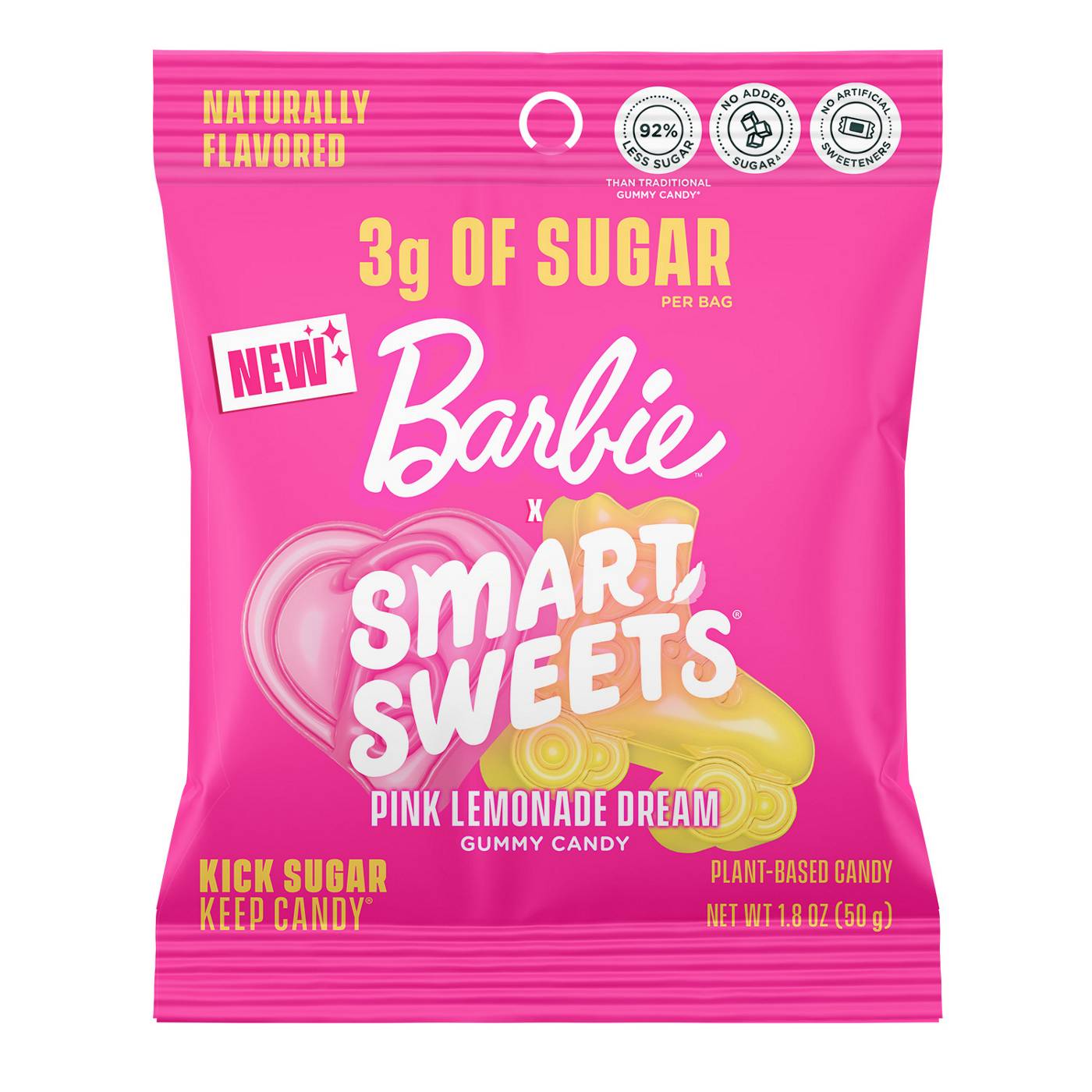 Enjoy NEW Pink Lemonade Dream Gummies with 92% less sugar per 50g versus traditional gummy candy. Three dreamy shapes: pink Barbie logo, pink heart, and yellow rollerblades.