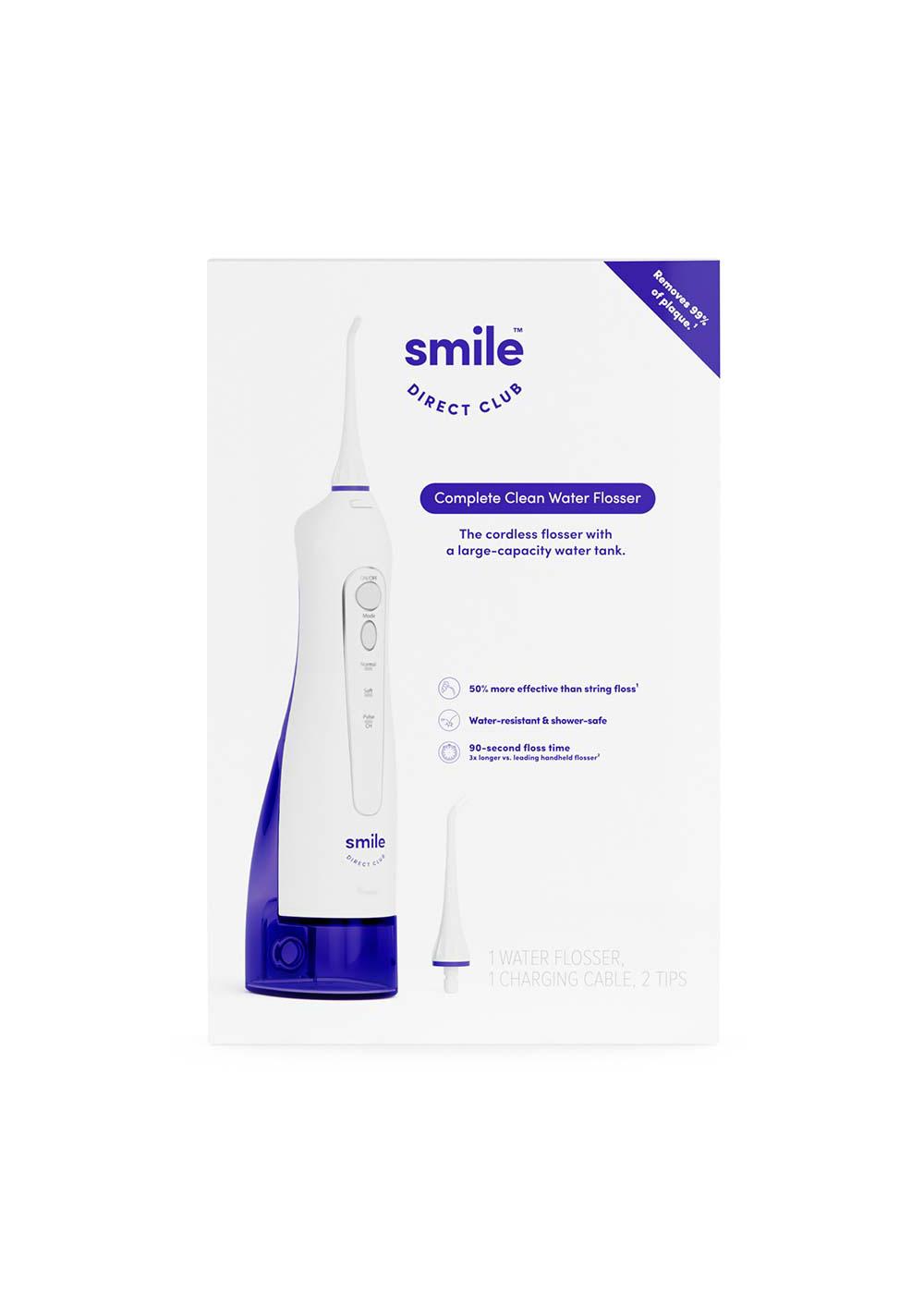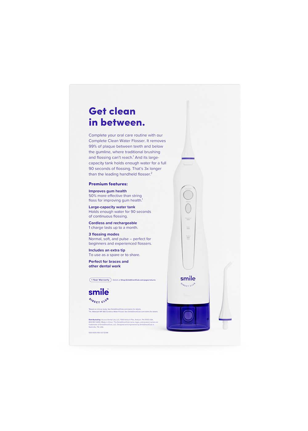 Get a deep clean in between! The Complete Clean reservoir holds enough water for about 90 seconds of flossing. Just fill with water, turn it on, and floss away. Featuring 3 pressure modes – normal, soft, and pulse – this water flosser is perfect for people with braces or other hard-to-clean dental work. The cordless design makes it easy to use, and you don’t have to worry about charging after every use. A single charge lasts a full month. Plus, it’s water-resistant – you can floss in the shower. Includes one extra flossing tip.