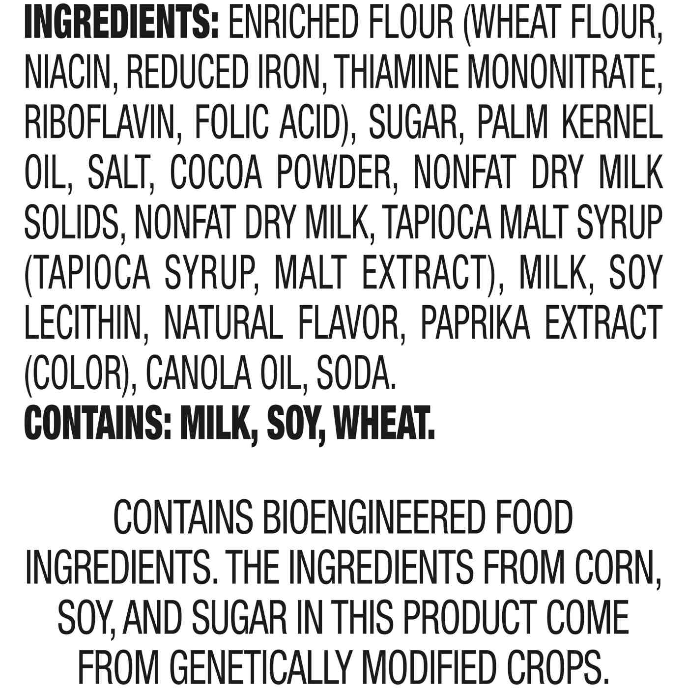 Enriched Flour (Wheat Flour, Niacin, Reduced Iron, Thiamine Mononitrate, Riboflavin, Folic Acid), Sugar, Palm Kernel Oil, Salt, Cocoa Powder, Nonfat Dry Milk, Solids Nonfat Dry Milk, Tapioca Malt Syrup (Tapioca Syrup, Malt Extract), Milk, Soy Lecithin, Natural Flavor, Paprika Extract (Color, Canola Oil, Soda.