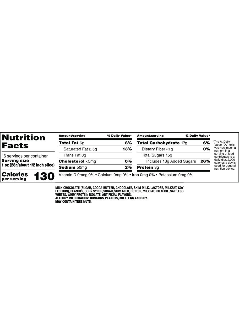 Milk Chocolate (Sugar, Cocoa Butter, Chocolate, Skim Milk, Lactose, Milkfat, Soy Lecithin), Peanuts, Corn Syrup, Sugar, Skim Milk, Butter, Milkfat, Palm Oil, Salt, Egg Whites, Whey Protein Isolate, Artificial Flavors.Allergens and safety warnings