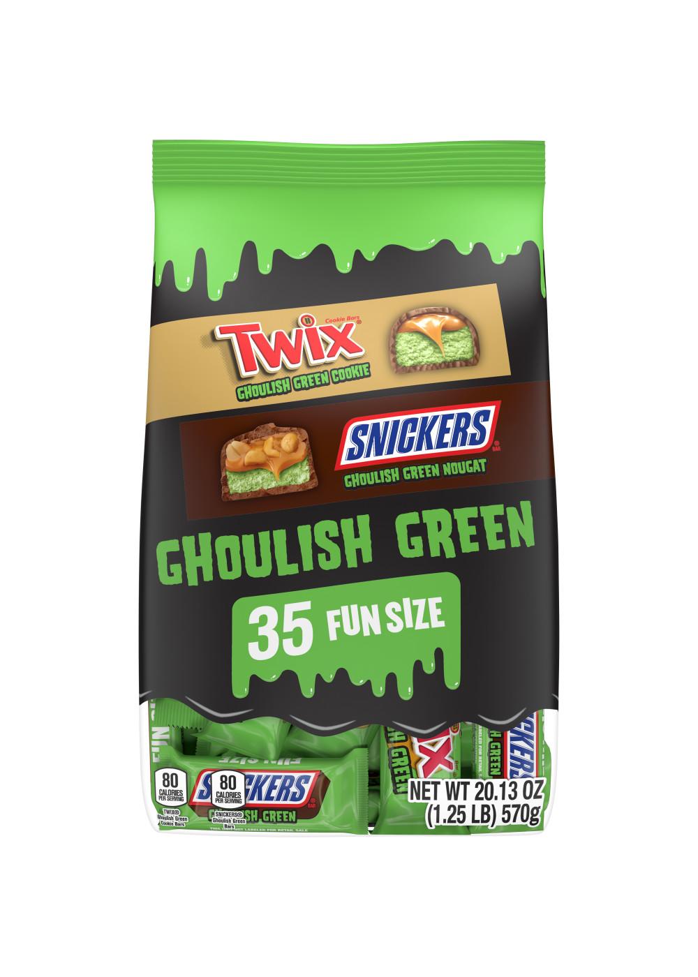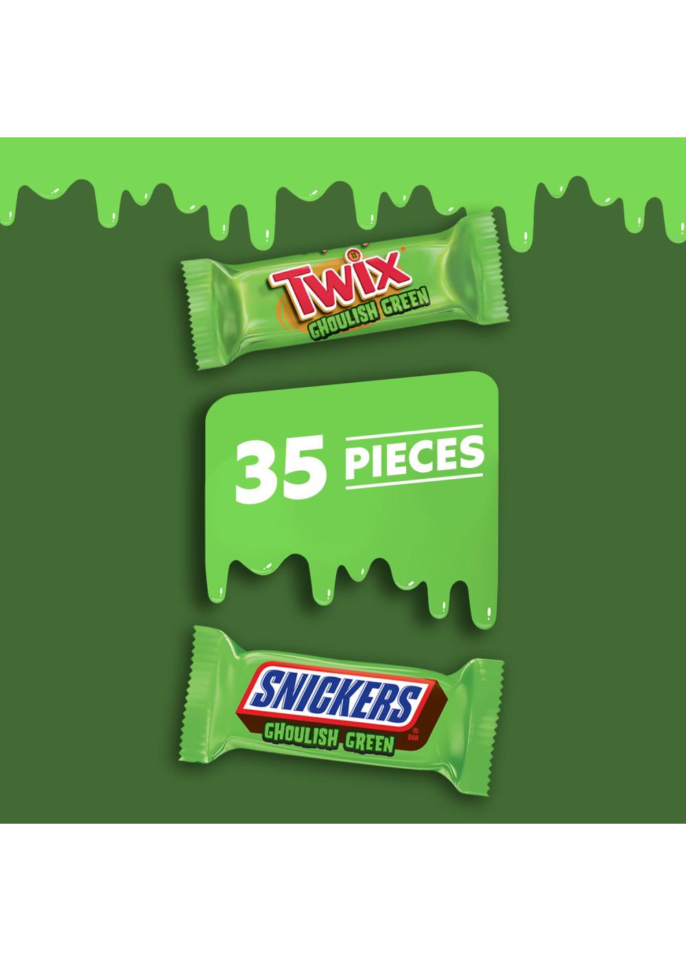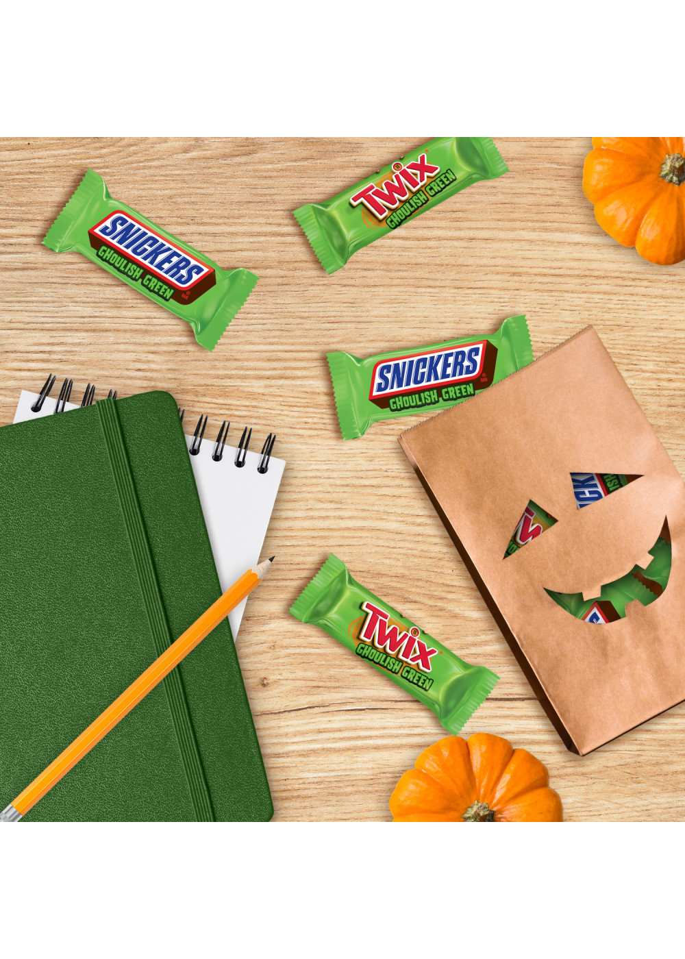 Contains one (1) 20.13-ounce bulk bag filled with 35 fun size SNICKERS and TWIX Ghoulish Green Halloween candy bars