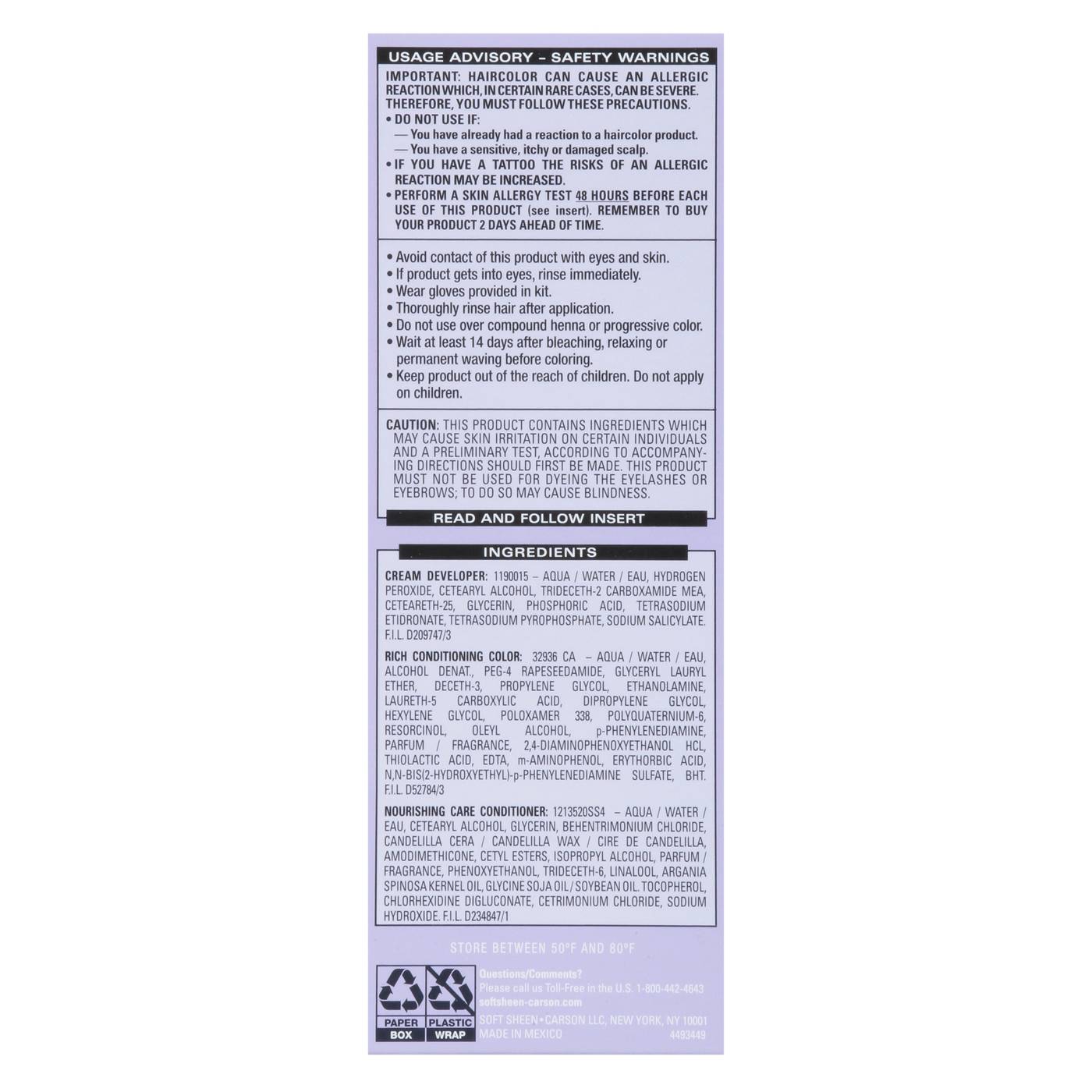 Important: Follow the usage advisory. Haircolor can cause an allergic reaction. Usage Advisory - Safety Warnings: Important: Haircolor can cause an allergic reaction which, in certain rare cases, can be severe. Therefore, you must follow these precautions. Do not use if: -You have already had a reaction to a haircolor product. -You have a sensitive, itchy or damaged scalp. If you have a tattoo the risks of an allergic reaction may be increased. Perform a skin allergy test 48 hours before each use of this product (see insert). Remember to buy your product 2 days ahead of time. Avoid contact of this product with eyes and skin. If product gets into eyes, rinse immediately. Wear gloves provided in kit. Thoroughly rinse hair after application. Do not use over compound henna or progressive color. Wait at least 14 days after bleaching, relaxing or permanent waving before coloring. Keep product out of the reach of children. Do not apply on children. Caution: This product contains ingredients which may cause skin irritation on certain individuals and a preliminary test, according to accompanying directions should first be made. This product must not be used for dyeing the eyelashes or eyebrows; to do so may cause blindness.
