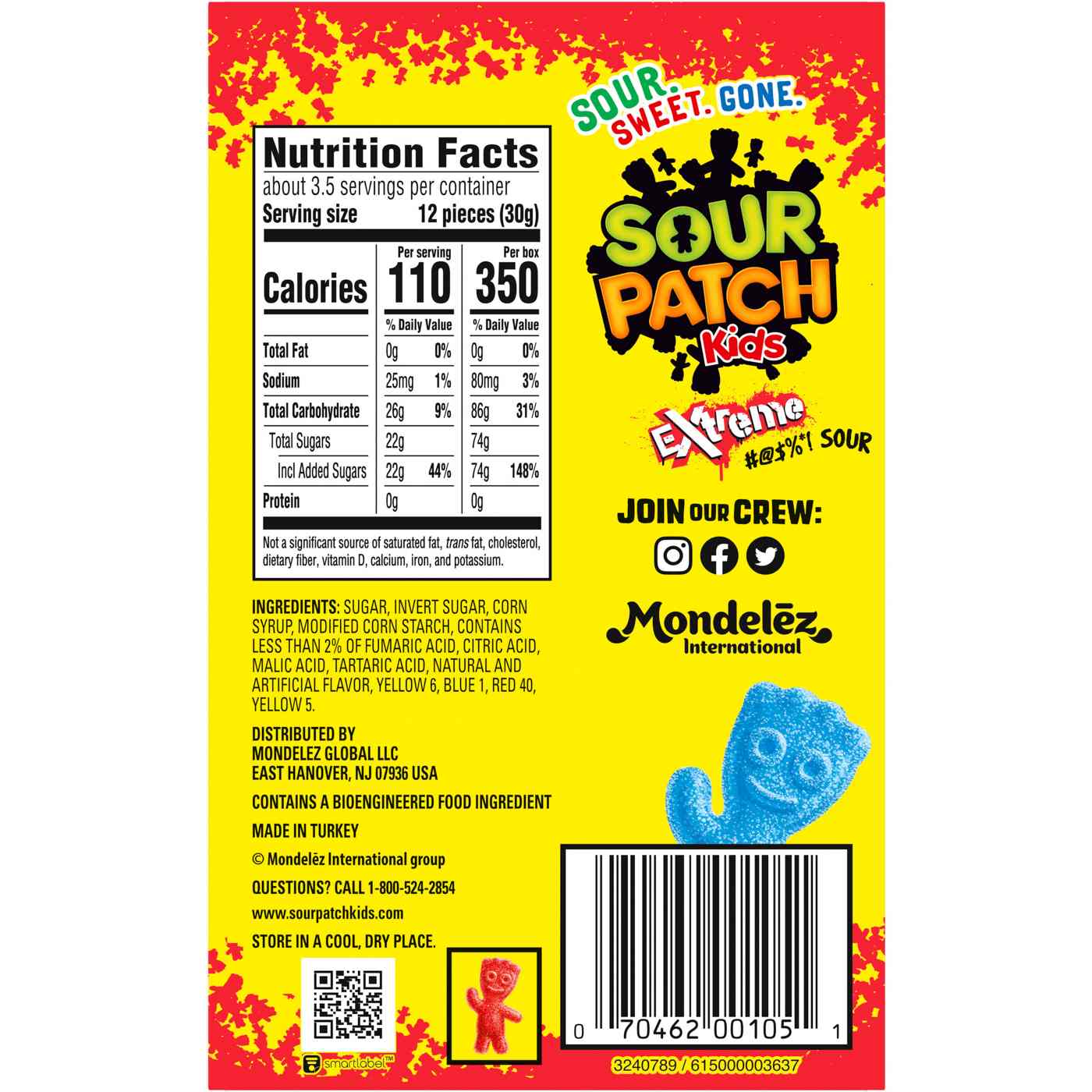 SOUR PATCH KIDS Extreme Sour Soft & Chewy Candy packs more mischief into each bite with its extreme SOUR THEN SWEET flavor. These chewy gummy snacks snacks give your taste buds an extreme kick with five assorted fruit flavors and a mouth-puckering, super sour taste. Keep SOUR PATCH KIDS on-hand for quick snacks, dessert toppers and party favors. This soft candy also makes a great movie theater candy to snack on during your favorite flick.