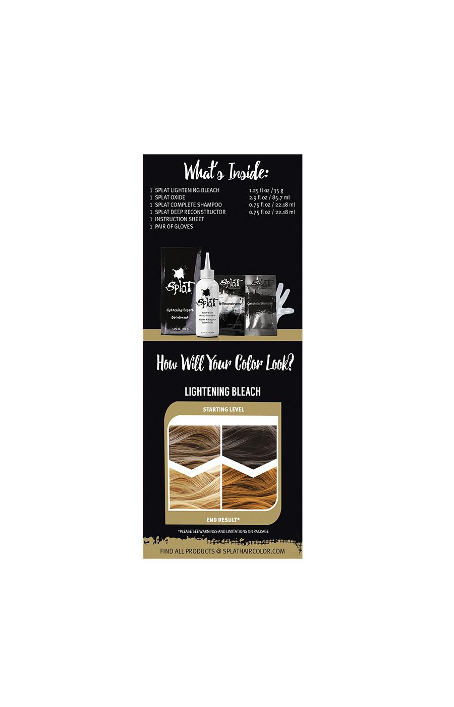 Bleach Powder Ingredients: Del Decolorante: Potassium Persulfate, Magnesium Carbonate, Ammonium Persulfate, Sodium Metasilicate, Sodium Stearate, Cyamopsis Tetragonoloba (Guar) Gum, Mineral Oil, Sodium Silicate, Tetrasodium EDTA, Sodium Lauryl Sulfate, Sodium Persulfate, Xanthan Gum, Fragrance, Carbomer, CI 77007, Splat Developer (Oxide) Del Revelador (Oxido): Water (Aqua/Eau), Hydrogen Peroxide, Splat Complete Shampoo Ingredients: Del Champu: Water (Aqua/Eau), Ammonium Lauryl Sulfate, Ammonium Laureth Sulfate, Cocamidopropyl Betaine, Cocamide MEA, Polyquaternium-7, Ethylhexylglycerin, Phenoxyethanol, EDTA, Fragrance, Splat Deep Reconstructor Conditioner Ingredients: Del Tratamiento: Water (Aqua/Eau), Aminopropyl Dimethicone, Cetearyl Alcohol, Cetyl Alcohol, Behentrimonium Methosulfate, Cocodimonium Hydroxypropyl Hydrolyzed Soy Protein, Cetrimonium Chloride, Stearyl Alcohol, Laureth-23, Laureth-4, Ethylhexylglycerin, Phenoxyethanol, Disodium EDTA, Fragrance.Allergens and safety warnings