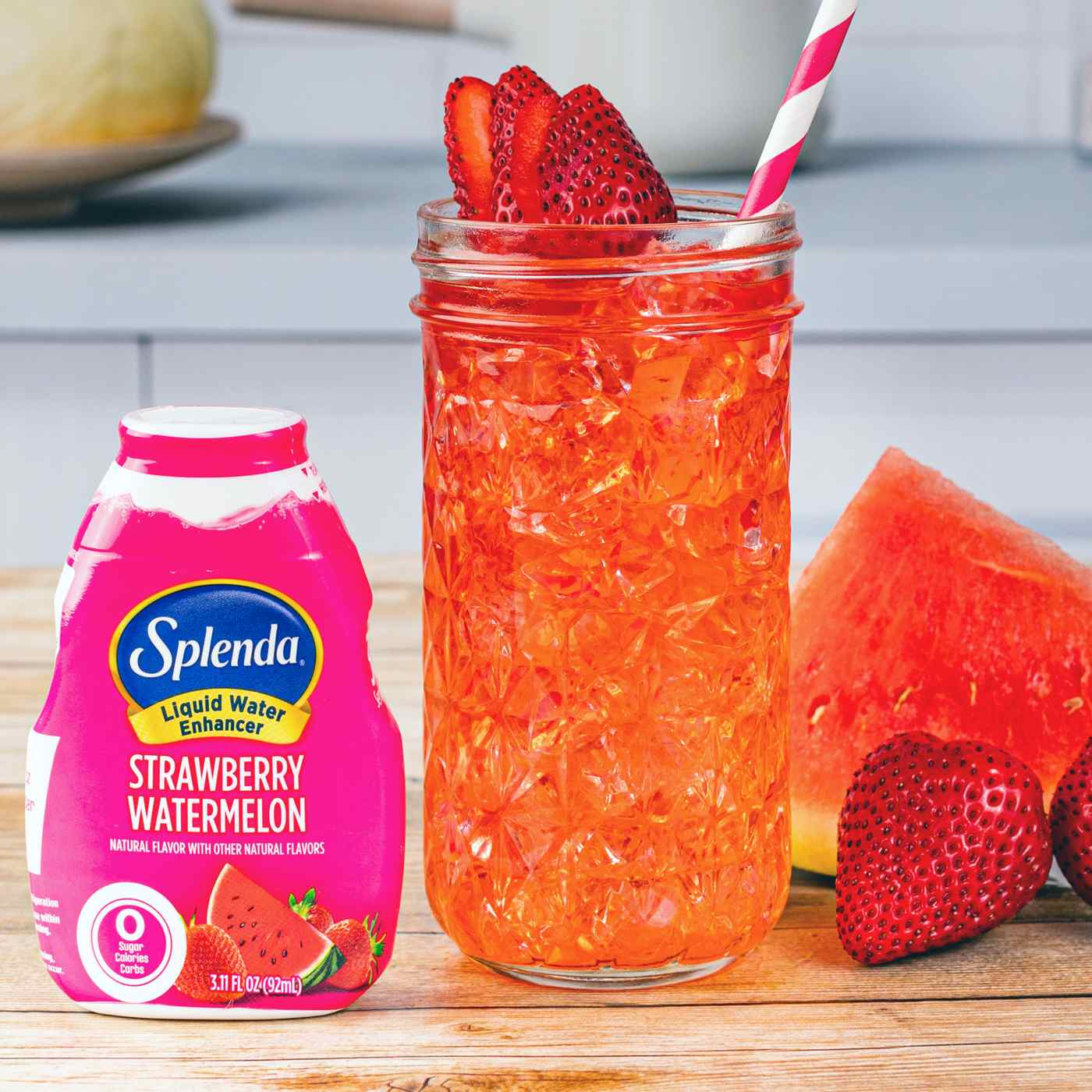 Just squeeze in Splenda Strawberry Watermelon Liquid Water Enhancer into your water for a fun fruity flavor. Splenda Liquid Water Enhancers pair amazing flavor to create an easy way to enhance your daily water intake without adding calories, sugar, or carbs. Made with natural flavors, each bottle contains about 30 servings of delicious taste in a conveniently portable, leak-proof bottle for use at home and on-the-go.