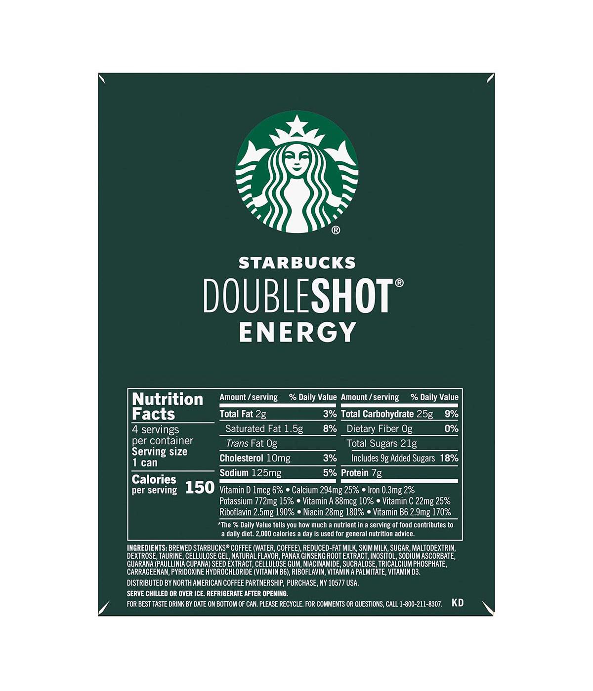 Brewed Starbucks Coffee (Water, Coffee), Reduced-Fat Milk, Skim Milk, Sugar, Maltodextrin, Dextrose, Taurine, Cellulose Gel, Natural Flavor, Panax Ginseng Root Extract, Inositol, Sodium Ascorbate, Guarana (Paullinia Cupana) Seed Extract, Cellulose Gum, Niacinamide, Sucralose, Tricalcium Phosphate, Carrageenan, Pyridoxine Hydrochloride (Vitamin B6), Riboflavin, Vitamin A Palmitate, Vitamin D3.