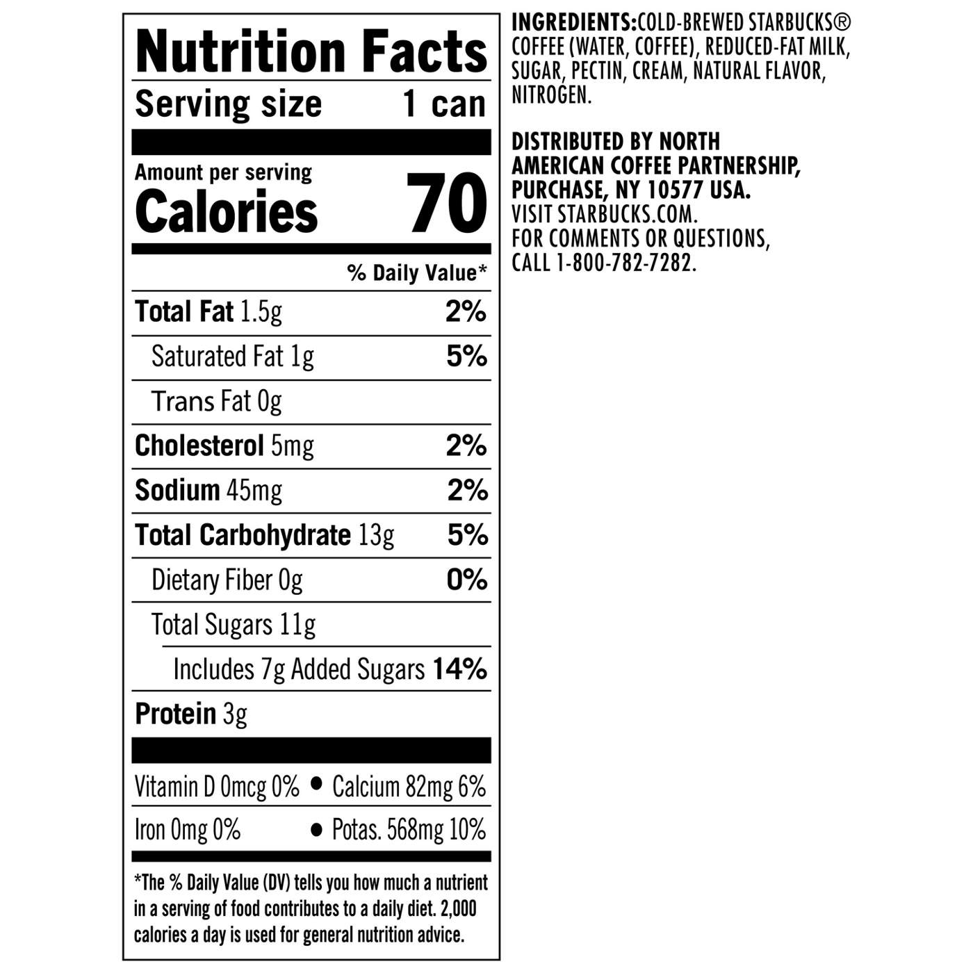 70 calories per can. Splash of sweet cream. Nitrogen-infused cold brew. Our signature black cold brew is infused with nitrogen the moment you open it, creating a rush of creamy texture and smooth, delicious taste. Crafted to perfection with just the right amount of sweet cream. starbucks.com. Visit starbucks.com. For comments or questions, call 1-800-782-7282.