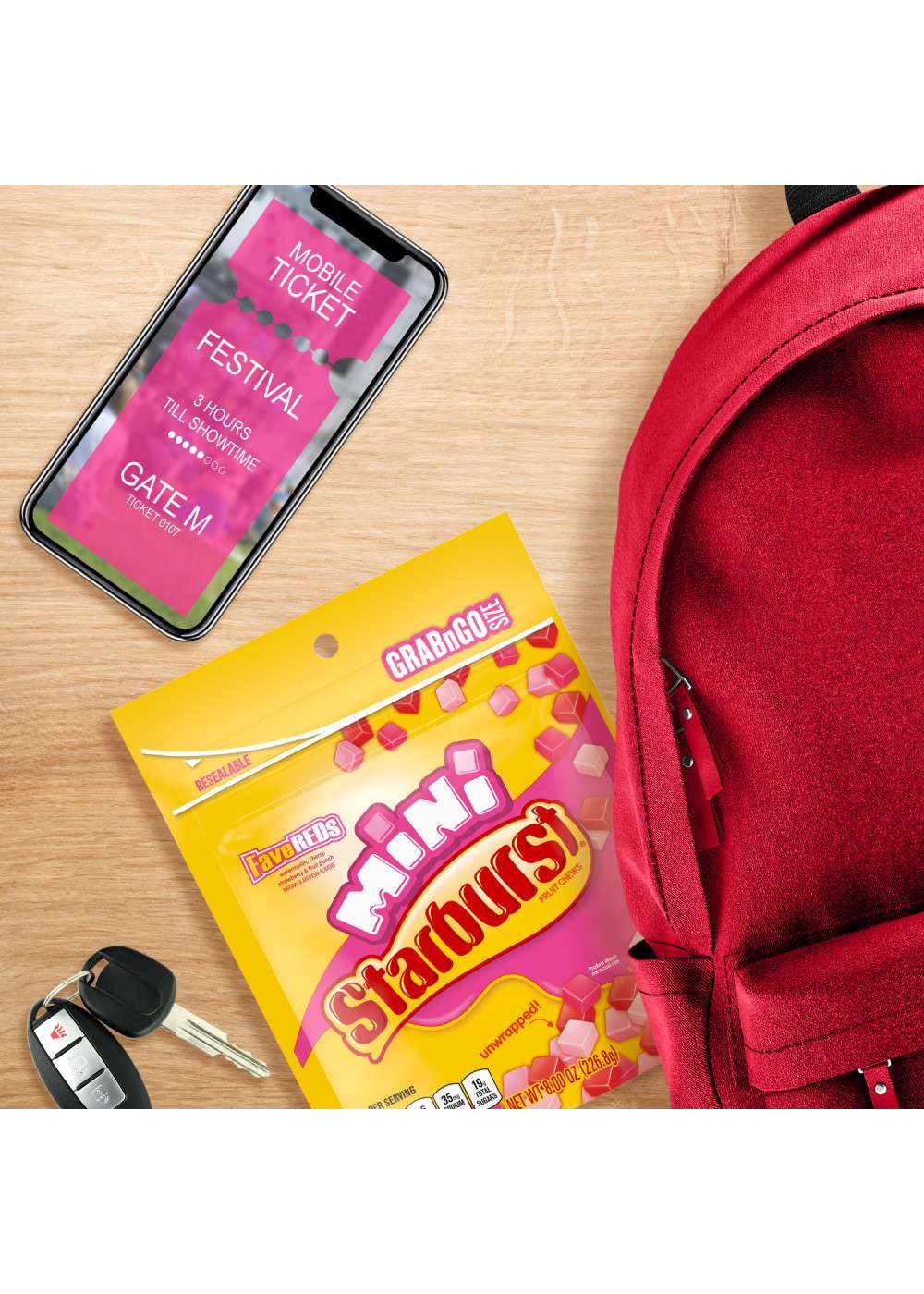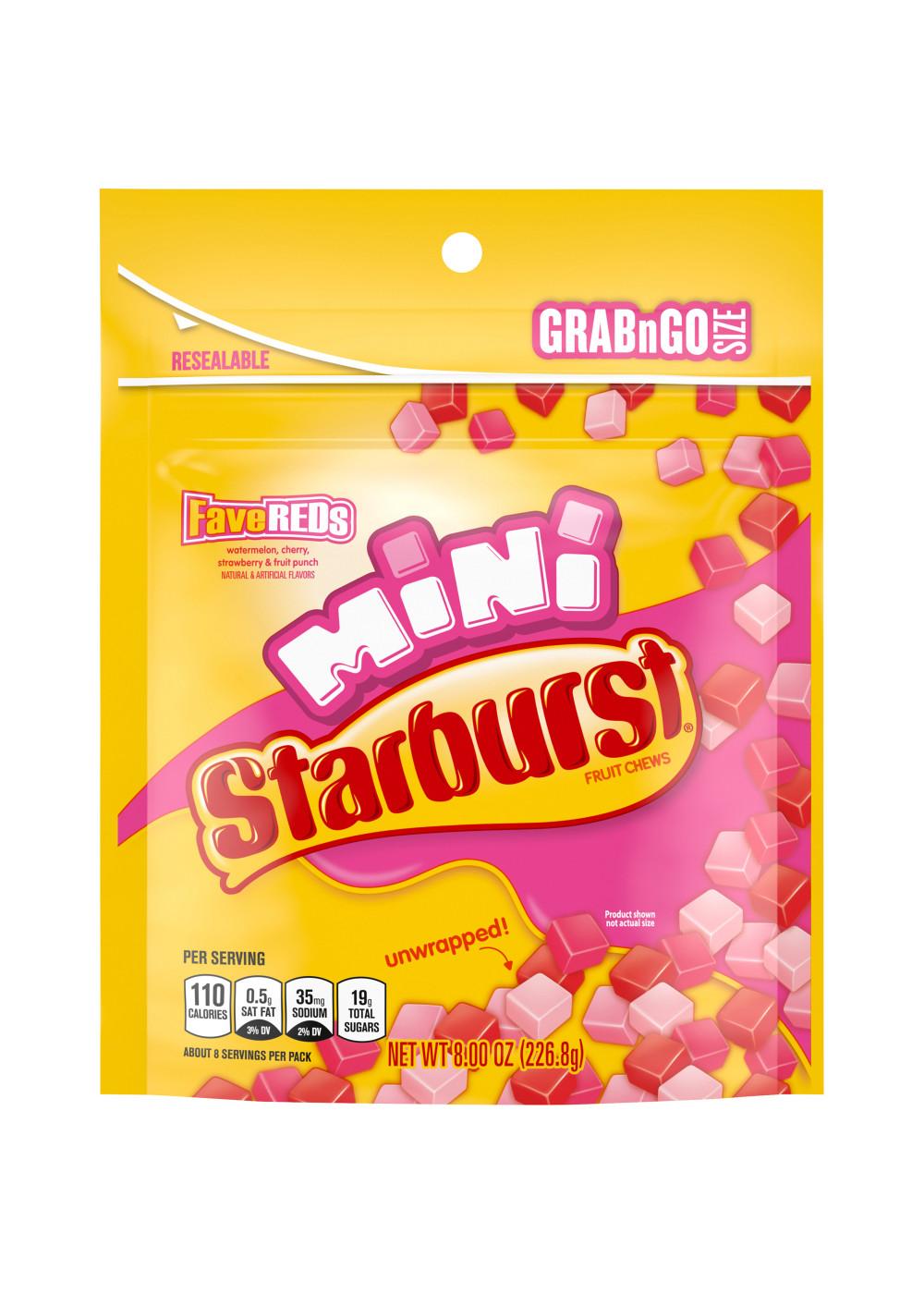 • Contains one (1) 8-ounce Grab N Go resealable bag of STARBURST Minis FaveREDs Fruit Chews Candy