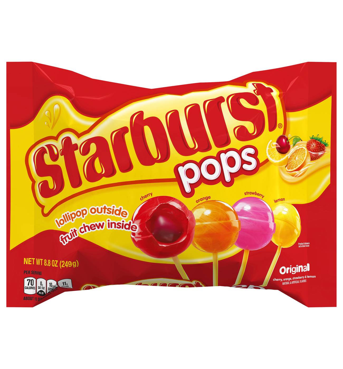 Experience a fun, unique twist on the classic Starburst flavor with these delicious Starburst Pops. A tasty hard candy shell envelops a delicious fruit chew in the center, making for an amazingly unique candy-eating experience. Featuring four classic Starburst flavors—strawberry, cherry, orange and lemon—you'll be able to enjoy everything you love about Starburst in these fun pops!