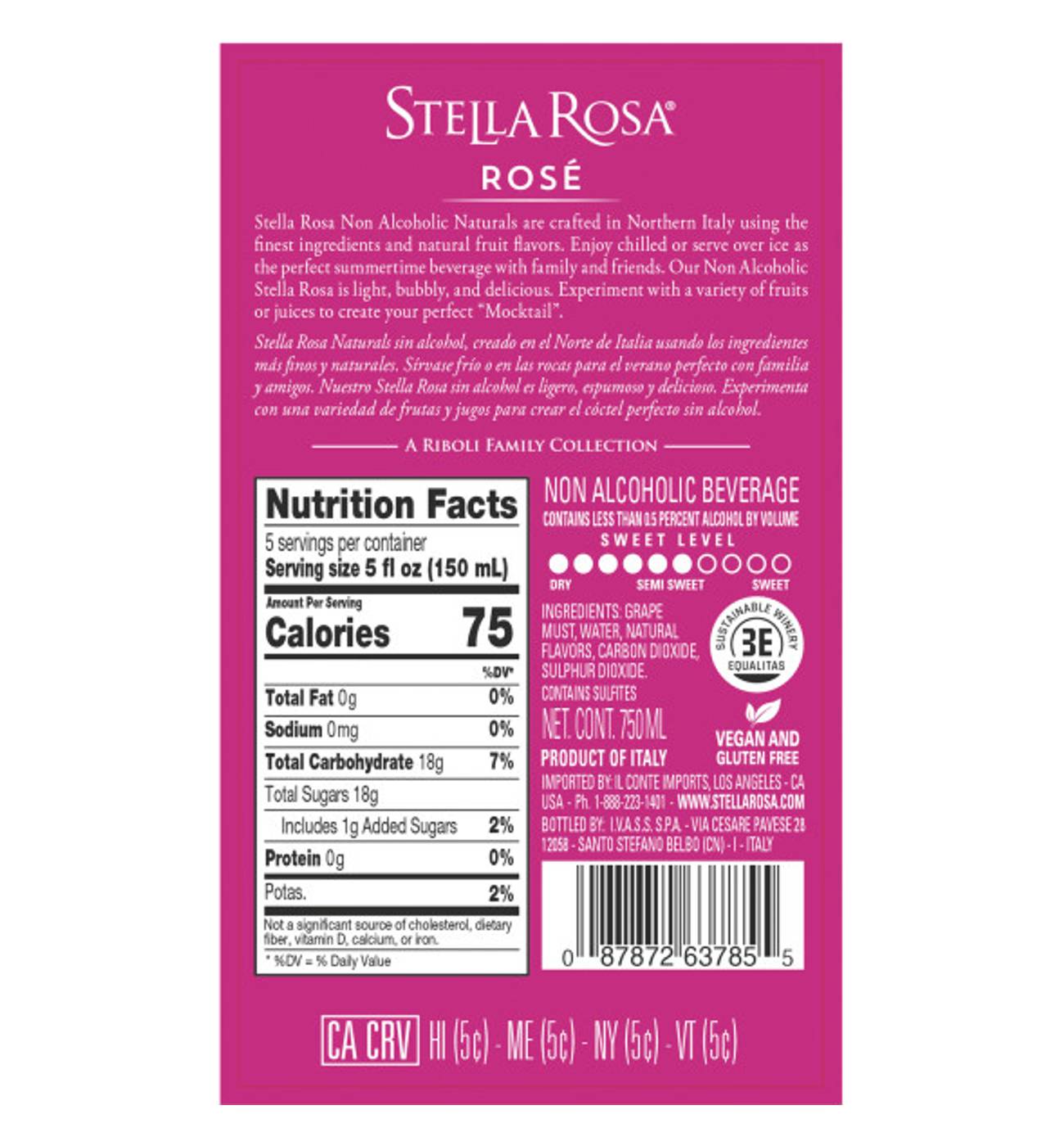 Stella Rosa Naturals Rose Non-Alcoholic Wine is a proprietary blend of several red grape varietals including Brachetto. The wine is combined with the natural flavors of an off-dry Rosé, bursting with berry flavors. With fun, fresh, and fruity in mind, our team of Italian winemakers sought to craft the same great taste of Stella Rosa, but in a non-alcoholic form. The wine contains natural carbonation. Once the desired sweetness is achieved, the wine is centrifuged and bottled. Its natural acidity and low pH strike the perfect balance with the wine’s inherent sweetness. It is not cloying or heavy. Try this delicious (and guilt-free) Stella Rosa Naturals Rose chilled or over ice in your favorite cocktail/ mocktail. It’s the perfect beverage for any time of day and for any occasion.
