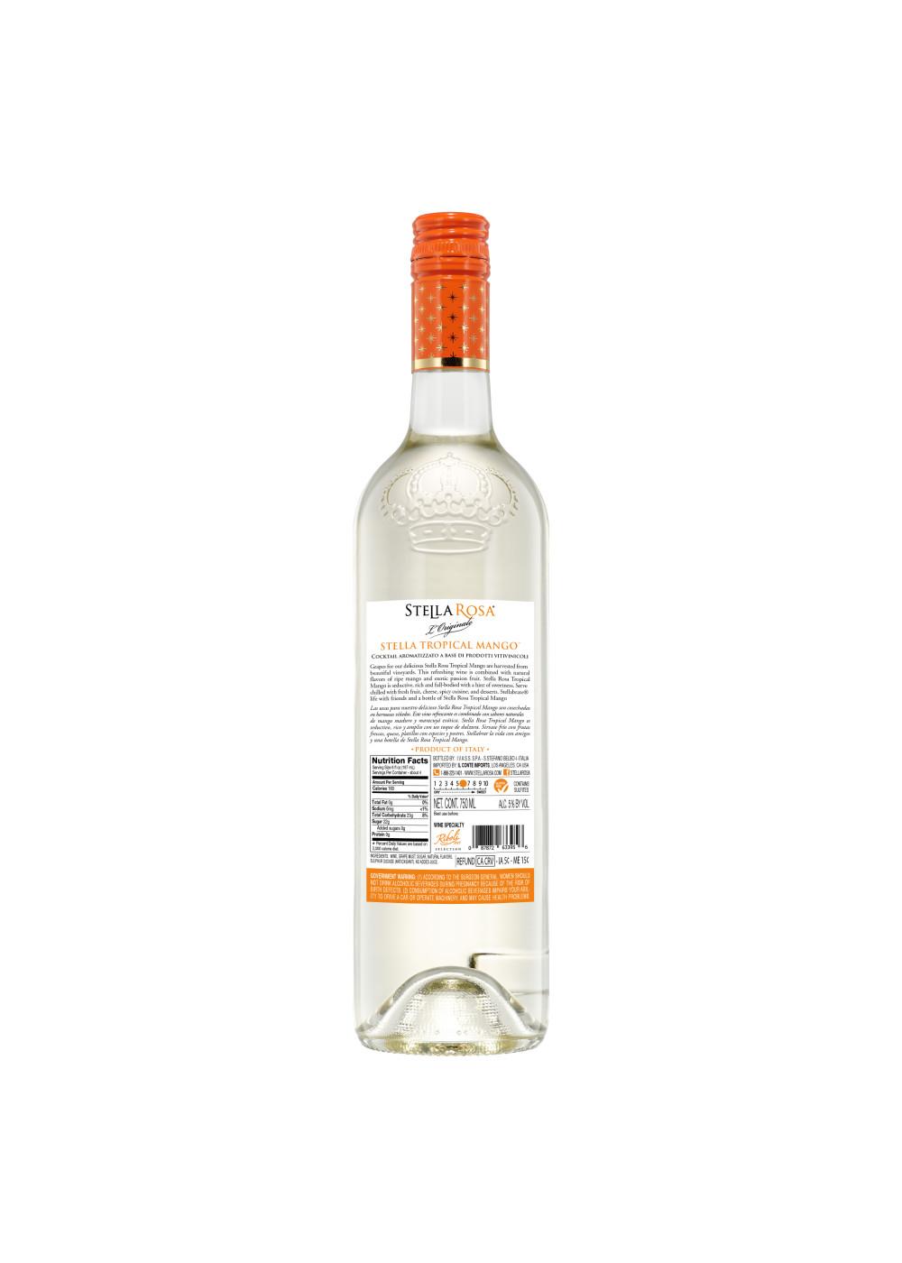 Stella Rosa Tropical Mango Semi-Sweet White Wine is crafted in the small village of Santo Stefano Belbo, born from the beautiful hillside vineyards of the Piedmont region of Northern Italy. The Riboli Family has created this special blend of several aromatic grape varietals including Moscato Canelli. The grapes are harvested, pressed, centrifuged, and then held cold as juice at 28 degrees Fahrenheit. The juice is fermented at various intervals throughout the year allowing the wine to remain fresh and delicate. The Riboli family uses this technique to capture the natural flavors of ripe mango and exotic passion fruit. During fermentation process, the alcohol is created in tandem with the wine’s natural carbonation. Once the desired sweetness is achieved, the wine is centrifuged and bottled. Its natural acidity and low pH strike the perfect balance with the wine’s inherent sweetness. It is not cloying or heavy. Serve chilled by-the-glass, pour over ice, or mix with your favorite spirit for an all natural, fruit-forward cocktail.