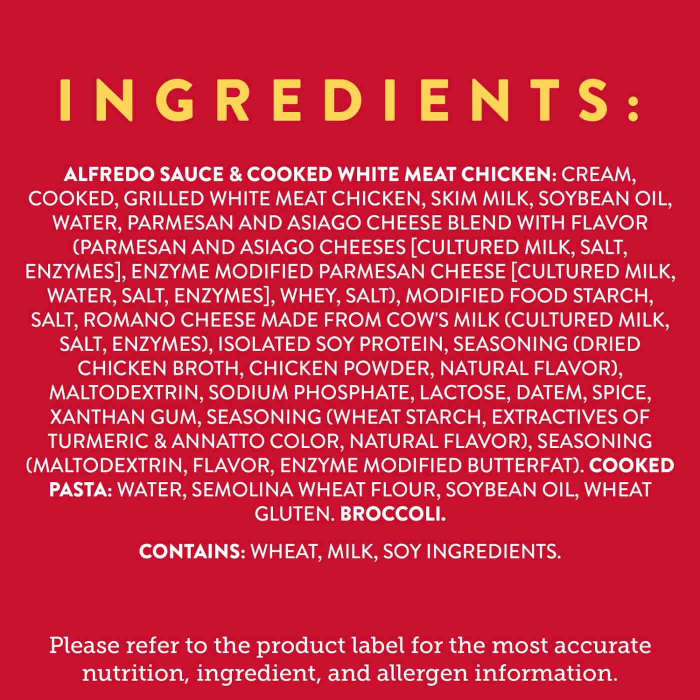 COOKED PASTA (WATER, SEMOLINA WHEAT FLOUR, WHEAT GLUTEN), MILK, COOKED WHITE MEAT CHICKEN (WHITE MEAT CHICKEN, WATER, ISOLATED SOY PROTEIN, MODIFIED FOOD STARCH, SEASONING [DRIED CHICKEN BROTH, CHICKEN POWDER, NATURAL FLAVOR], SODIUM PHOSPHATE, MALTODEXTRIN, SALT), WATER, BROCCOLI, PARMESAN AND ASIAGO CHEESE BLEND WITH FLAVOR (PARMESAN AND ASIAGO CHEESES [CULTURED MILK, SALT, ENZYMES], ENZYME MODIFIED PARMESAN CHEESE [CULTURED MILK, WATER, SALT, ENZYMES], WHEY, SALT), 2% OR LESS OF MODIFIED FOOD STARCH, SOYBEAN OIL, SALT, ROMANO CHEESE WITH FLAVOR (ROMANO CHEESE [CULTURED COW'S MILK, SALT, ENZYMES], ENZYME MODIFIED ROMANO CHEESE [ROMANO CHEESE {CULTURED COW'S MILK, WATER, SALT, ENZYMES}, SALT]), GARLIC, SPICES, DATEM, MONO- AND DIGLYCERIDES, GARLIC POWDER, XANTHAN GUM, MALTODEXTRIN, NATURAL FLAVOR.Allergens and safety warnings