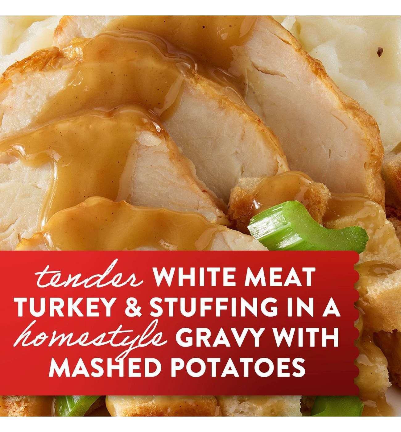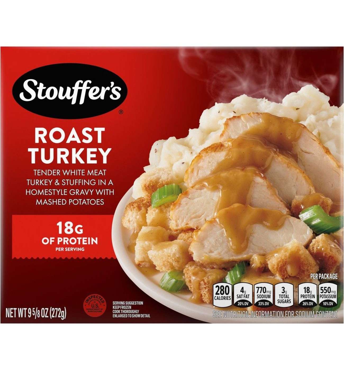 • CRAFTED WITH QUALITY YOU CAN TASTE: Stouffer’s Turkey Dinner is thoughtfully crafted with flavorful, quality ingredients. It includes tender white meat turkey & stuffing in a homestyle gravy with mashed potatoes