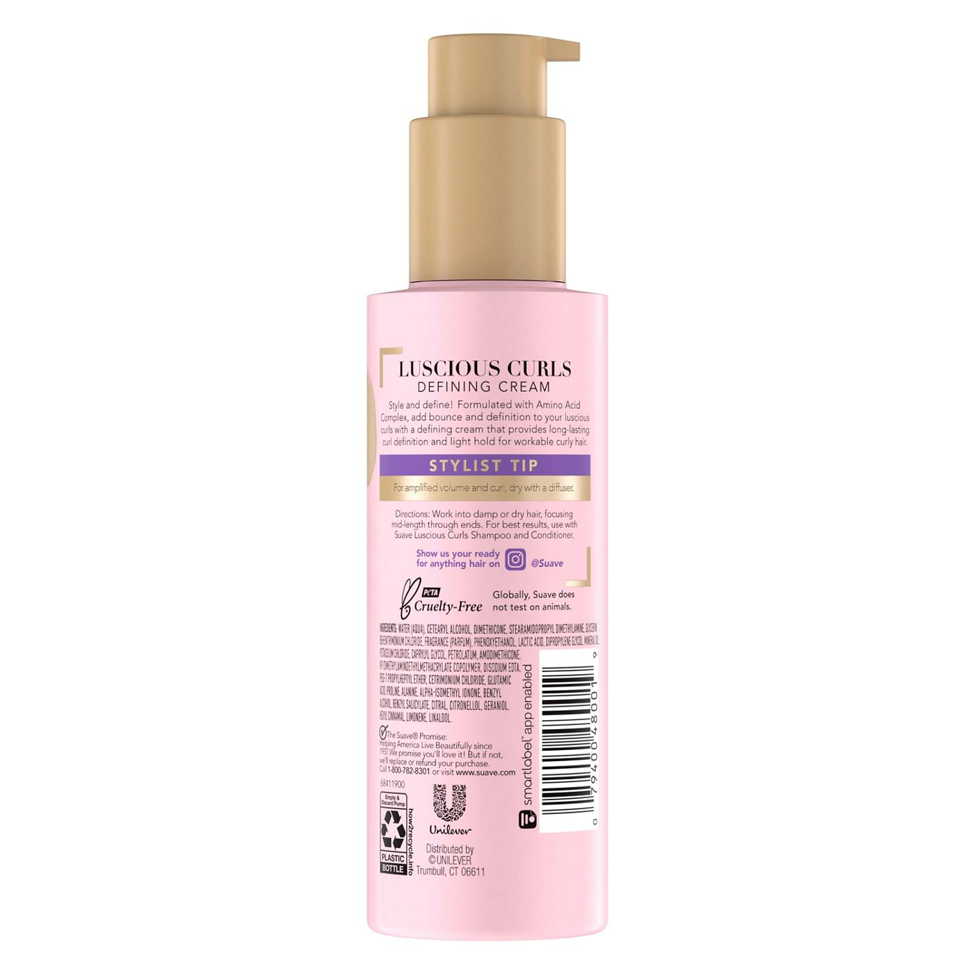 Give your stunning curls the definition they deserve. Suave Luscious Curls Defining Cream, with Amino Acid Complex, moisturizes and shapes for gorgeous and workable curly hair. This curl enhancing cream smooths the outside of the hair fiber.Looking for workable, ready for anything hair? Say hello to our professional inspired 3-step haircare regimen. This collection includes products to cleanse, condition and shape your hair into the perfect look, plus use our additional stylers depending on how you style your hair. This hair cream was created to keep hair strong, more manageable and ready to style any look.Our curl defining cream, formulated with Amino Acid Complex, improves hairs suppleness and manageability. The result is hair thats more supple, easier to style and that holds your style (aka the hair of your dreams).Its time to transform your hair into manageable, ready-to-style locks. Use this styling cream with Suave Luscious Curl shampoo and conditioner for curly, workable hair thats ready for anything.