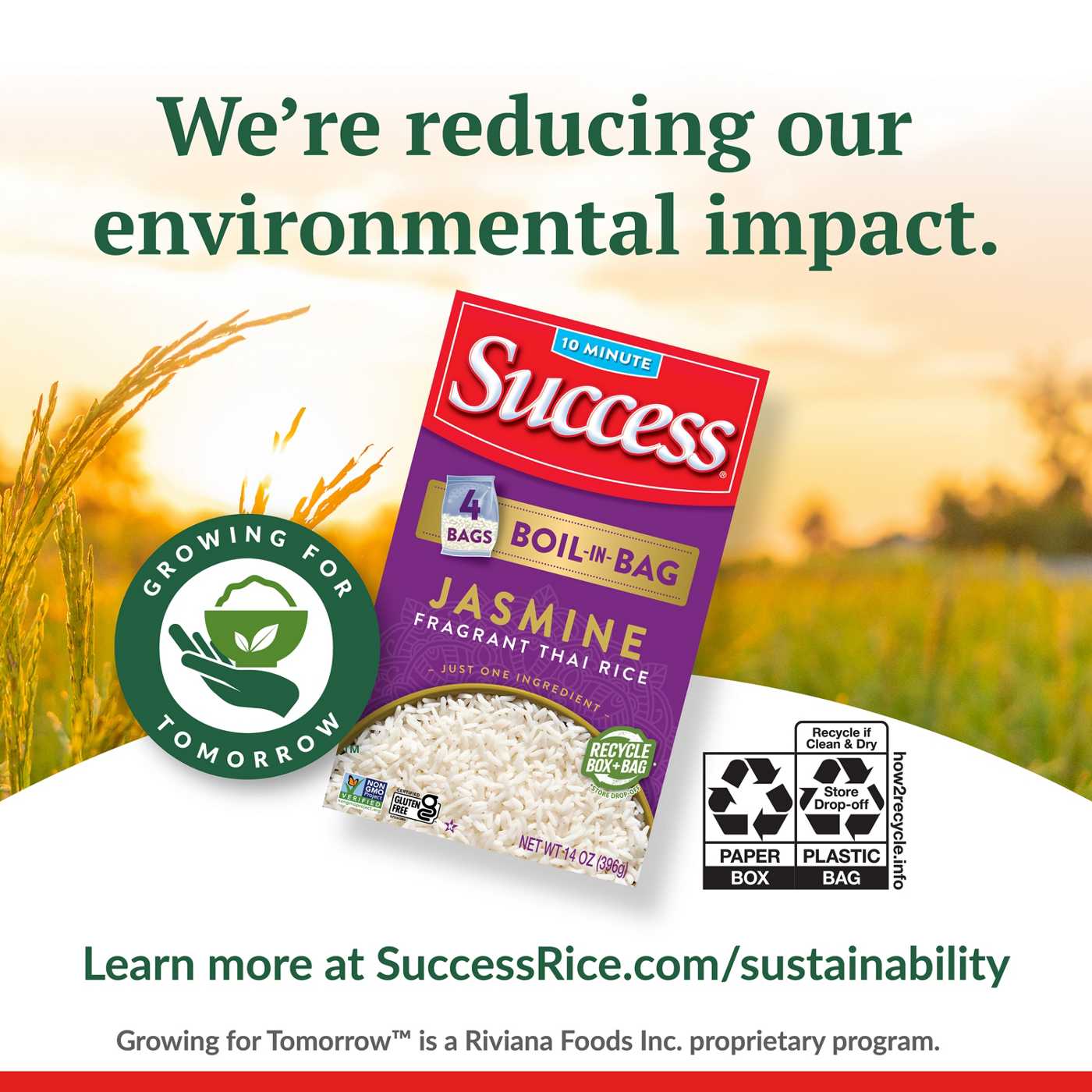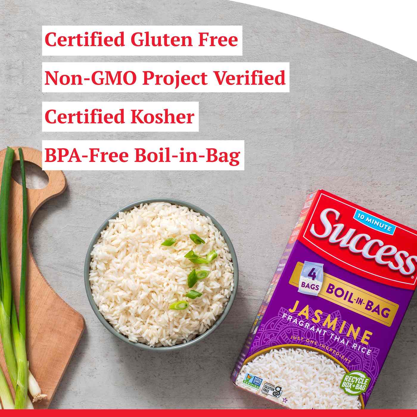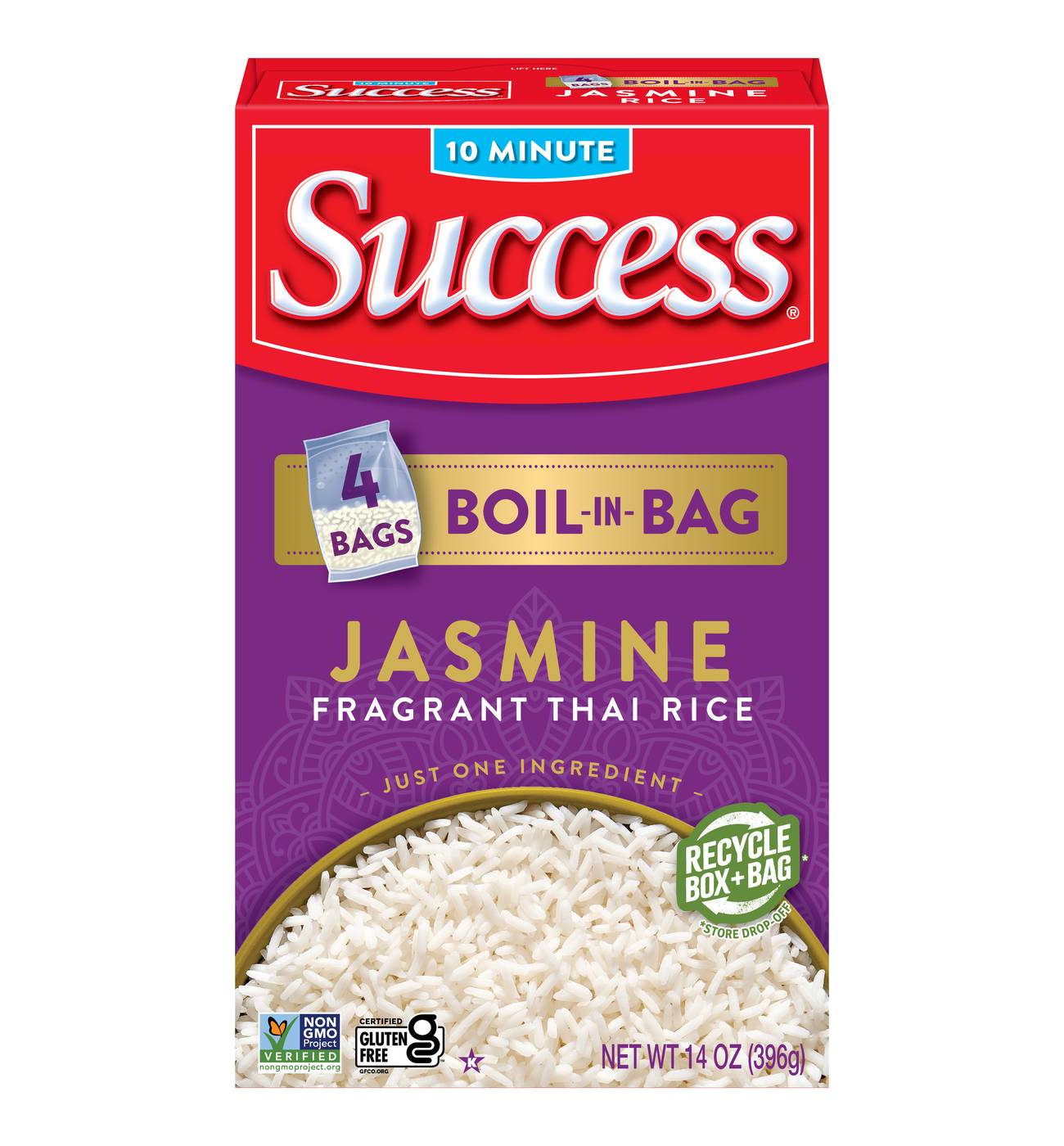 Jasmine Rice is a fragrant long grain rice that was originally cultivated for the Kingdom of Thailand, but you certainly don’t need to be royalty to enjoy our premium Success Boil-in-Bag Jasmine Rice. It is known for its distinctive aromatic scent and when cooked, the rice is soft and fluffy and has a subtle, sweet buttery flavor. This rice is ideal for Asian-inspired recipes such as fried rice or as a base for rice bowls. It can also be used for sweet treats like rice pudding recipes or Thai specialties like coconut jasmine rice with mango. Learn how to cook our jasmine rice in just 10 minutes on the stove, in a rice cooker or in an Instant Pot, with a soft and fluffy texture every single time. Success Jasmine Rice is Non-GMO Project Verified, Certified Gluten Free, and Kosher Certified.• One 14 oz box (4 bags) of Success Boil-in-Bag Thai Jasmine Rice• Make meals exceptional with just one ingredient, jasmine rice; it cooks up perfectly in 10 minutes• Create amazing dishes like rice salads, vegetable fried rice, or chocolate rice pudding• BPA-Free Boil-in-Bag offers easier prep with no measure or mess• No preservatives, Gluten-Free, no MSG, Non-GMO Project Verified, and Kosher Certified