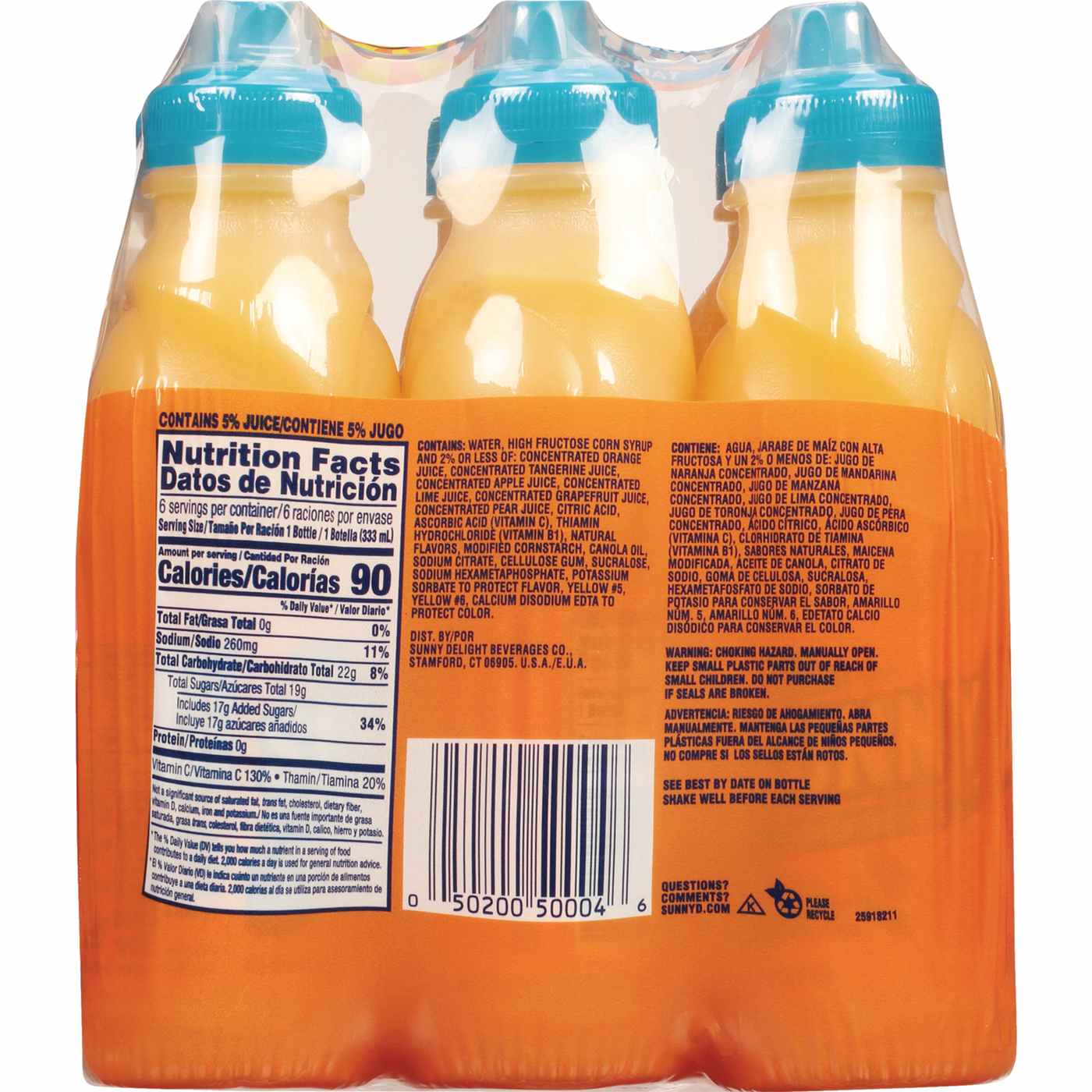 Experience the one-of-a-kind deliciousness of Sunny D Tangy Original. Bright orange in color, this vitamin C drink is perfect for the whole family. With 130% daily value of vitamin C and just 90 calories per bottle, this citrus punch contains 5% fruit juice. This six pack of individual kids' drinks makes it easy to pack a beverage in lunches.