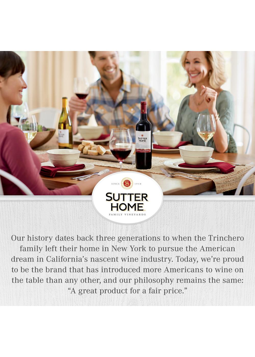 Sutter Home Chardonnay White Wine is rich and elegant with a silky-smooth texture. Fresh aromas of ripe pear and zesty citrus lead to creamy peach and juicy apple flavors on the palate in a refreshingly silky-smooth wine with a round, creamy, lingering finish. Sutter Home Wine has been awarded over 600 Gold medals since 2004. Awards for this dry white wine include 91 points - Gold from 2021 Monterey Int'l Wine Competition Silver from 2023 Toast of the Coast Wine Competition. As you gather around the table this holiday season, enjoy Sutter Home wine in your favorite wine glasses with mashed potatoes, chicken, turkey, stuffing and all the pumpkin & apple pies. Or get cozy around the fireplace and warm up while enjoying a glass of wine. Sutter Home wines is the perfect holiday gift. Whether you gift wine as a stocking stuffer, to your neighbor across the street, or serve at your own holiday table. Sutter Home wines are a great addition to holiday wine gift sets! Sutter Home, family owned since 1948, is the brand generations of wine lovers trust to deliver consistent, award-winning quality and value for every wine occasion.