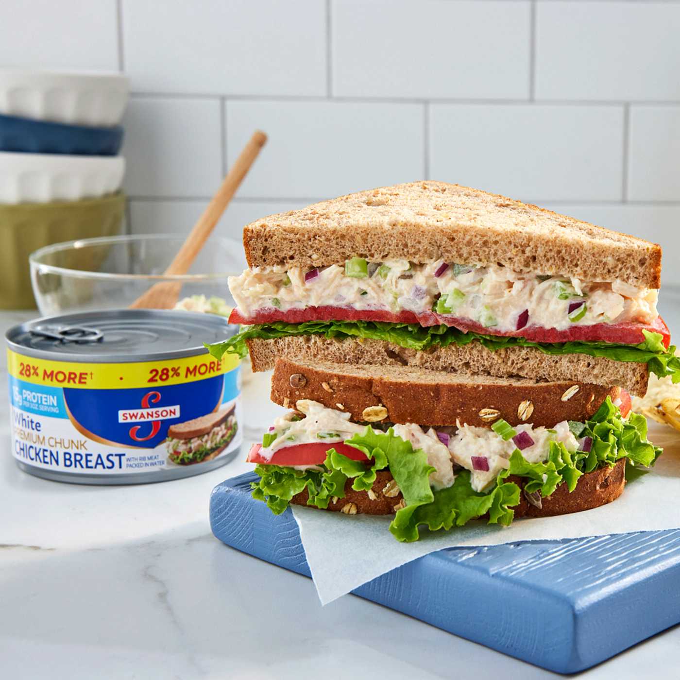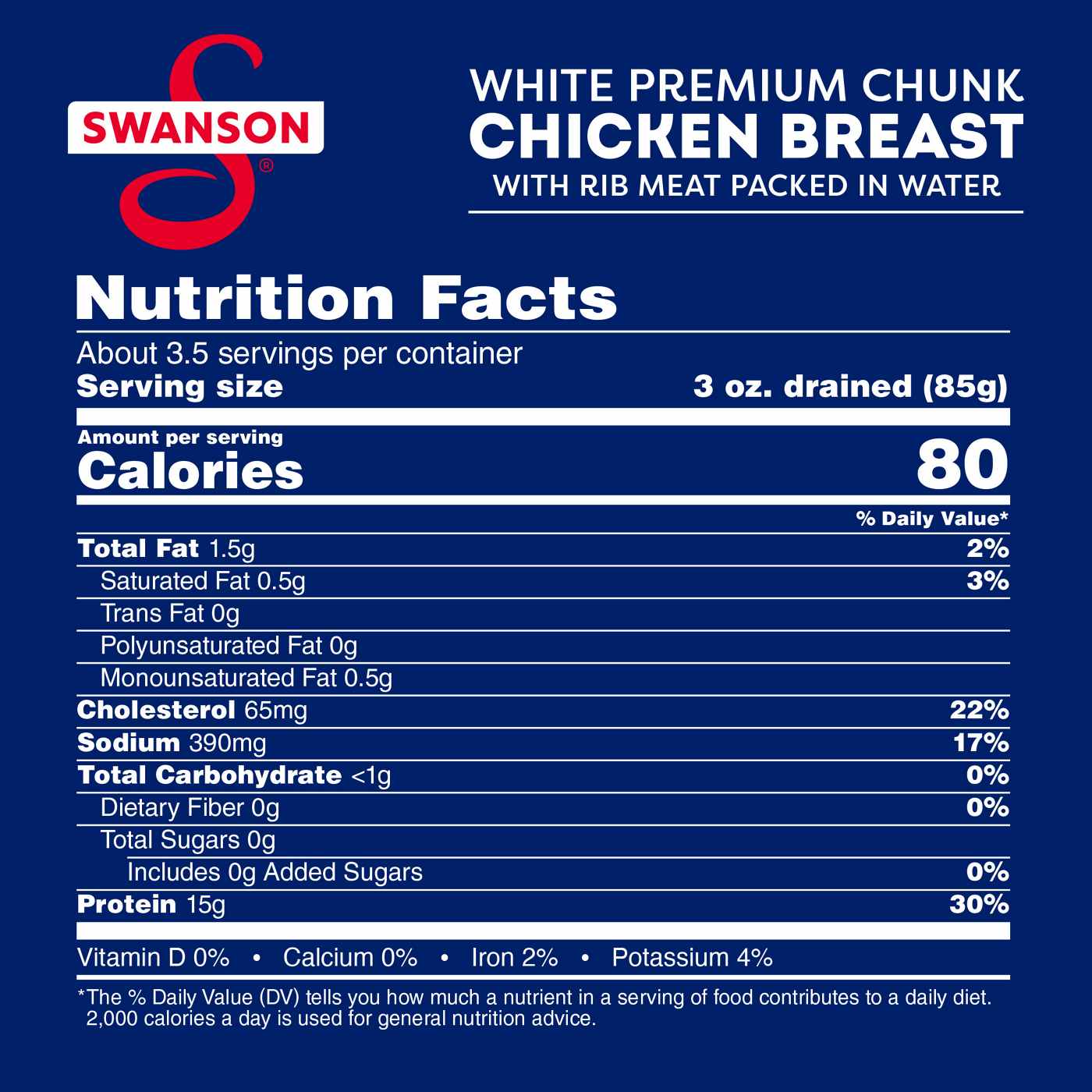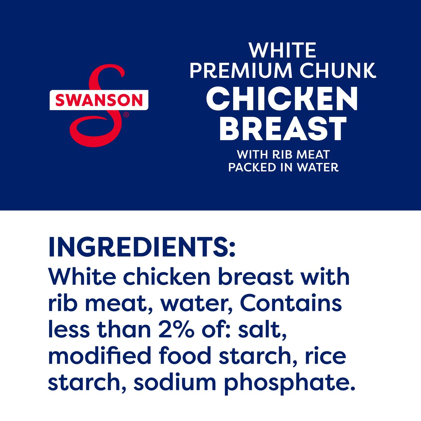 Enjoy a delicious shortcut to your favorite chicken dishes with Swanson White Premium Chunk Canned Chicken Breast in Water. Our ready-to-eat, fully cooked chicken chunks contain no antibiotics or added MSG. This premium white chicken meat is 98% fat free, gluten free and an excellent source of protein, with 15 grams in each 3-ounce serving. Eat it on crackers, add it to salads, or use it in any recipe that calls for diced chicken breast.One (1) 12.5 oz can of Swanson White Premium Chunk Canned Chicken Breast in WaterReady-to-eat, fully cooked chicken chunksPremium white chicken meat with no antibiotics or added MSG98% fat free, gluten free and an excellent source of protein, with 15 grams in each 3-ounce servingEat it on crackers, add it to salads, or use it in any recipe that calls for diced chicken breast, such as buffalo chicken dip or chicken salad