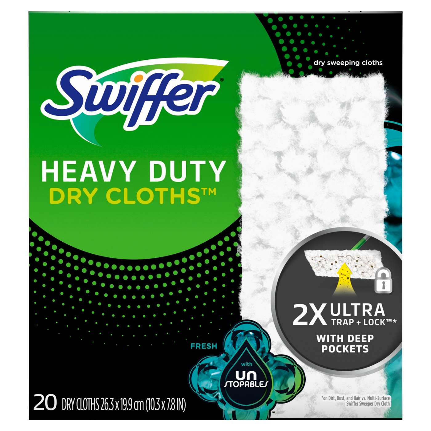 Swiffer Sweeper Heavy Duty Multi-Surface Dry Sweeping Cloths remove up to 95% of allergens* and TRAP + LOCK 2X more dirt, dust, and hair**, allowing you to clean all your hard floor surfaces quickly and easily. Use with your Swiffer Sweeper Dust Mop - the convenient combination of a broom and mop for a quick and easy clean. Experience Lasting Freshness*** with Swiffer Heavy Duty Dry Sweeping Cloths, now in the Fresh, Clean, and Airy Unstopables Scent you love!*Leaves behind up to 1 hour of freshness after initial product use*Common inanimate allergens from cat and dog dander & dust mite matter**vs. Multi-Surface Swiffer Sweeper Dry Cloth***Leaves behind up to 1 hour of freshness after initial product use
