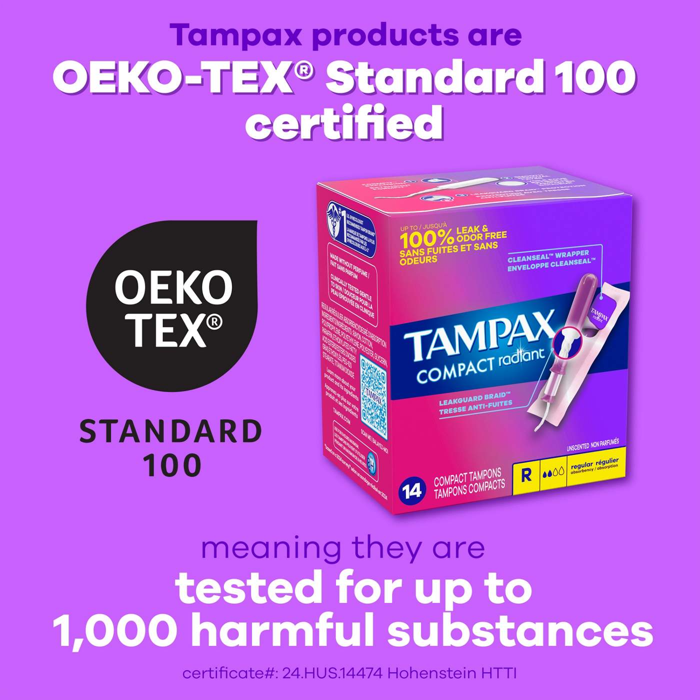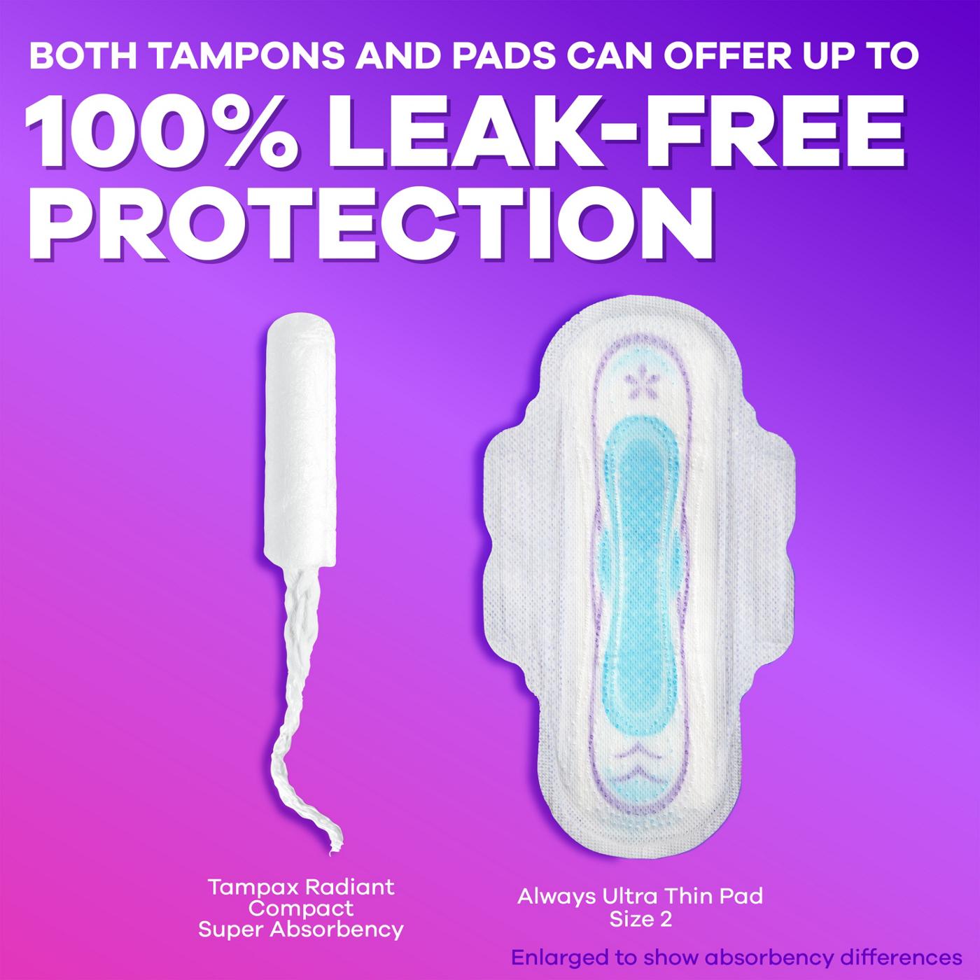 It's a new time for that time of the month. Get up to 100% leak and odor free protection with Tampax Compact Radiant tampons - the same incredible protection of Tampax Radiant tampons now in a compact extendable applicator. Tampax Compact Radiant tampons have a LeakGuard Braid to help stop leaks before they happen. Plus, they come in CleanSeal Wrapper for quiet and easy disposal. Tampax Compact Radiant tampons have an anti-slip grip for comfortable insertion. Protection you can count on is as easy as 1-2-3 with Tampax Compact Radiant. Step 1: Pull out the Pusher. Step 2: Click it into Place. Step 3: Push to insert. Plus, Tampax Tampons are made with body safe* ingredients. Choose from three different absorbencies to match your changing flow. Leaking? Go up an absorbency. Uncomfortable to remove? Go down an absorbency. Tampax Compact Radiant Tampons have a smooth comfort layer for easy removal, even on your light days. Tampax Tampons are made without perfume. Plus, Tampax products are OEKO TEX standard 100 certified, meaning they are tested for up to 1,000 harmful substances (Certificate #24.HUS.14474). Ready to ditch the leaks? Get incredible protection with Tampax, the #1 tampon brand recommended by U.S. Gynecologist (based on 2024 survey). Discover your perfect flow combo and get the protection you need. *All materials meet FDA Medical Device biocompatibility criteria and are safe when used as intended. HOW TO INSERT A TAMPON: Slowly insert the tampon applicator from the tip, all the way to the grip, then push the pusher. After you've pushed the pusher in all the way, pull the applicator out. How to remove a tampon: You'll use your thumb and finger to grip the string and pull it slowly out. Properly dispose of your tampon in the trash.