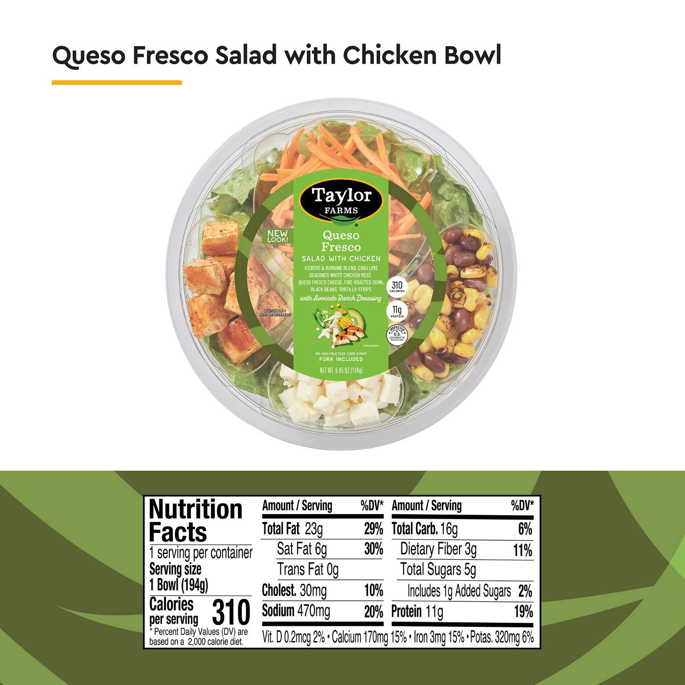 Taylor Farms Queso Fresco ready to eat salad bowl is the perfect grab-on-the-go lunch, packed with 11 grams of protein! This salad includes a fork along with delicious and fresh iceberg and romaine salad blend, chili lime seasoned chicken, queso fresco cheese, fire-roasted corn, black beans, tortilla strips and an avocado ranch dressing.