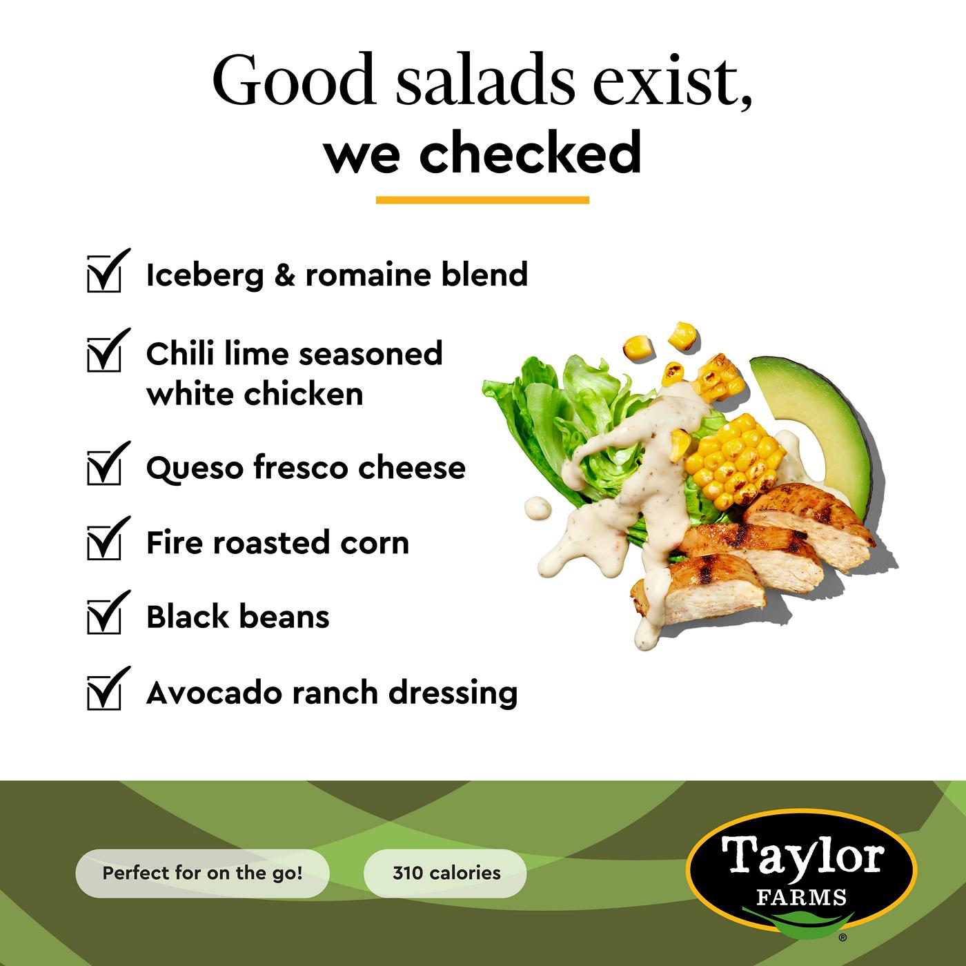 Iceberg Lettuce, Avocado Ranch Dressing (Soybean Oil and/or Canola Oil, Water, Sour Cream Powder [Sour Cream, Cultured Nonfat Milk, Lactic Acid], Sugar, Lime Juice Concentrate, Cilantro, Avocado, Salt, Egg Yolk, Distilled Vinegar, Cultured Dextrose, Dehydrated Onion, Modified Corn Starch, Dehydrated Garlic, Lemon Peel, Xanthan Gum, Yeast Extract, Dehydrated Red Bell Pepper, Spices), Grilled Chili Lime Seasoned Chicken Breast Meat With Rib Meat (Chicken Breast Meat With Rib Meat, Water, Less Than 2% Brown Sugar, Salt, Rice Starch, Spices [Including Paprika], Vinegar, Chili Pepper, Natural Flavor, Lime Oil), Romaine Lettuce, Queso Fresco Cheese (Queso Fresco Cheese [Pasteurized Milk, Cheese Culture, Salt, Enzymes], Powdered Cellulose [To Prevent Caking], Natamycin [A Natural Mold Inhibitor]), Carrot, Roasted Corn, Black Beans, Tortilla Strips (Stone Ground White, Yellow And Blue Corn Masa Flour, Sunflower And/Or Corn Oil, Sea Salt, Beet Juice Concentrate [Color]).Allergens and safety warnings