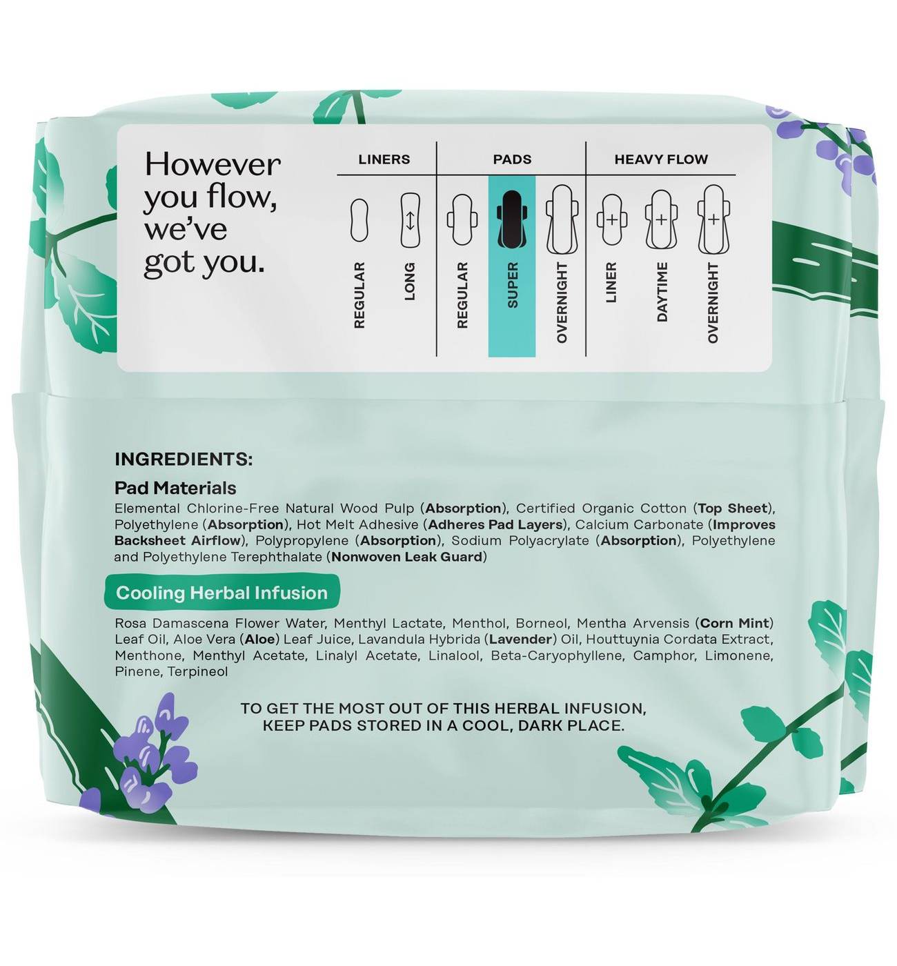Pad Materials: Elemental Chlorine-Free Natural Wood Pulp (Absorption), Certified Organic Cotton (Top Sheet), Polyethylene (Absorption), Hot Melt Adhesive (Adheres Pad Layers), Calcium Carbonate (Improves Backsheet Airflow), Polypropylene (Absorption), Sodium Polyacrylate (Absorption), Polyethylene and Polyethylene Terephthalate (Nonwoven Leak Guard), Cooling Herbal Blend: Rosa Damascena Flower Water, Menthyl Lactate, Menthol, Borneol, Mentha Arvensis (Corn Mint) Leaf Oil, Aloe Vera (Aloe) Leaf Juice, Lavandula Hybrida (Lavender) Oil, Houttuynia Cordata Extract, Menthone, Menthyl Acetate, Linalyl Acetate, Linalool, Beta-Caryophyllene, Camphor, Limonene, Pinene, Terpineol.
