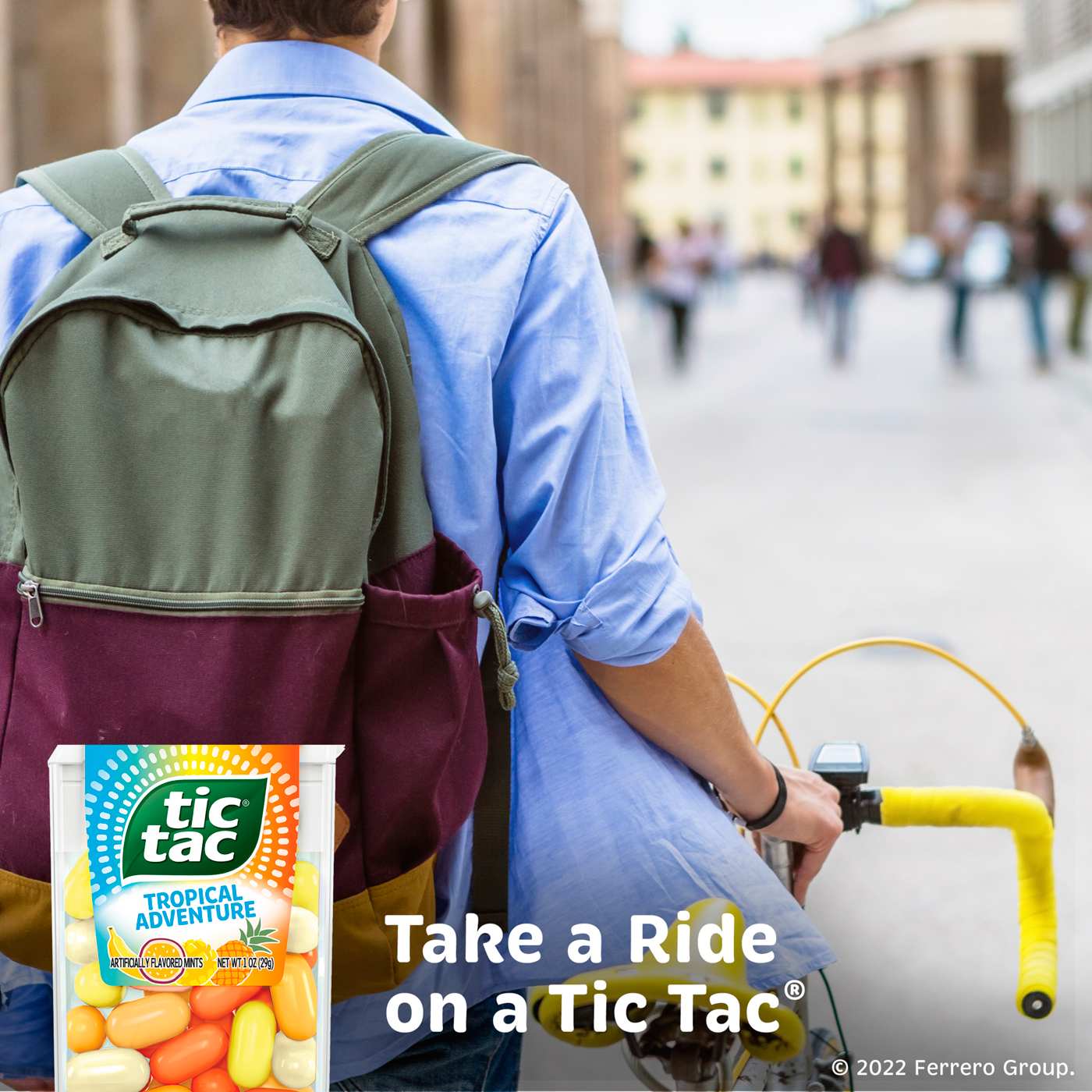 Enjoy the fun, fruity taste of Tic Tac Tropical Adventure mints. Each 1-ounce pack is filled with delicious mints ready to boost your confidence and refresh your day. Enjoy 100 layers of satisfying and delicious flavor in each pack of Tic Tac Tropical Adventure mints. The portable pack fits perfectly in your pocket or purse for on-the-go sharing. These gluten-free mints are satisfying and GMO-free! Tic Tac is an iconic brand of beloved mints. Whether you enjoy one or the whole pack, you've got a variety of flavors and sizes to choose from. Take a ride on a Tic Tac.