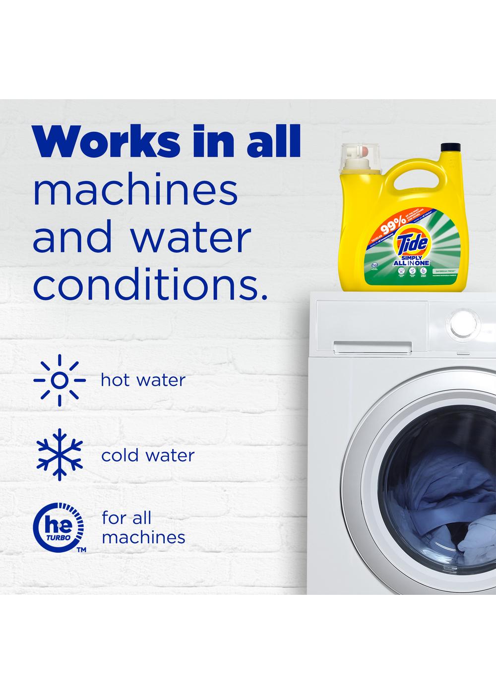 Tide Simply All-In-One liquid laundry detergent that tackles 99% of the most common stains and odours. This All-in-one detergent tackles stains, odours, has a fresh scent & works in coldwater. It is now more concentrated to provide more stain removal and freshness and less water (vs. previous formula).Also try our powerful Tide PODS laundry pacs.Measure your loads with cap. For medium loads, fill to bar 1. For large loads, fill to bar 3. For HE full loads, fill to bar 5. Add clothes, pour into dispenser, start washer.