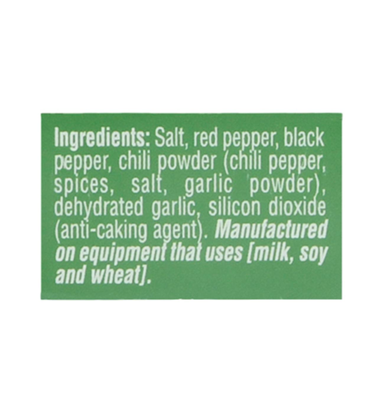 Salt, Red Pepper, Black Pepper, Chili Powder (Chili Pepper, Spices, Salt, Garlic Powder), Dehydrated Garlic, Silicon Dioxide (Anti-Caking Agent).