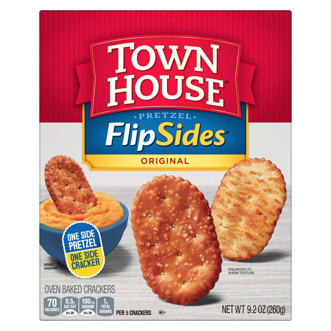 Flip into something delicious with Town House FlipSides Original crackers! This one-of-a-kind snack combines the salty crunch of pretzels with the rich taste of buttery crackers. Oven-baked for irresistible crunch, they’re perfectly munchable on their own and tasty with your favorite dips. Pair them with a creamy pub cheese for game night or set them out with savory spreads for holiday parties. From family hangouts to last-minute drop-ins, these pretzel-cracker combos are delightfully different snacks that bring fun to any get-together. Each cracker is baked in the USA with no artificial colors or flavors. Whether you’re snacking during the game, watching TV, or welcoming friends, set out a plate and grab your favorite dips. With Town House FlipSides crackers, you’re ready to say “Come on in!”• You'll flip for snack time with Town House FlipSides - half salty pretzel, half buttery cracker for a unique taste and irresistible crunch• Keep in the pantry for easy prep snacks so you’re ready to host anytime; Pair with pub cheese dip or savory spreads for a crowd-pleasing snack• Baked in the USA with no artificial colors or flavors; Town House has been crafting delicious crackers since 1940• Perfect for game night, parties, movie marathons, or catching up with friends; Discover crunchy pretzel crackers that make snack time extra fu• Includes one 9.2 oz box of Town House FlipSides Original crackers• SNAP and EBT eligible item