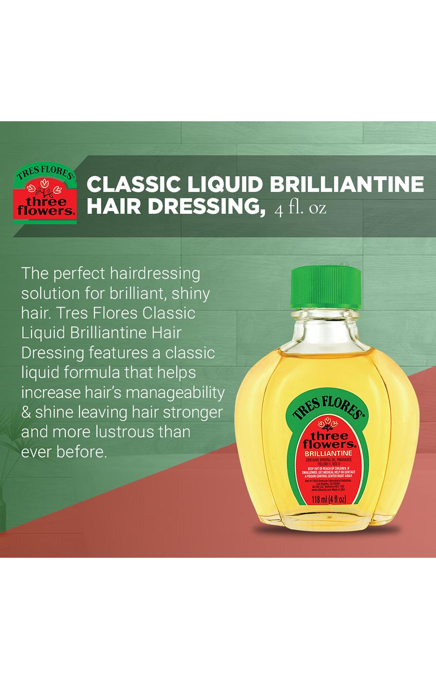 The perfect hairdressing solution for brilliant, shiny hair. Tres Flores Classic Liquid Brilliantine Hair Dressing features a classic liquid formula that helps increase hair's manageability & shine leaving hair stronger and more lustrous than ever before.