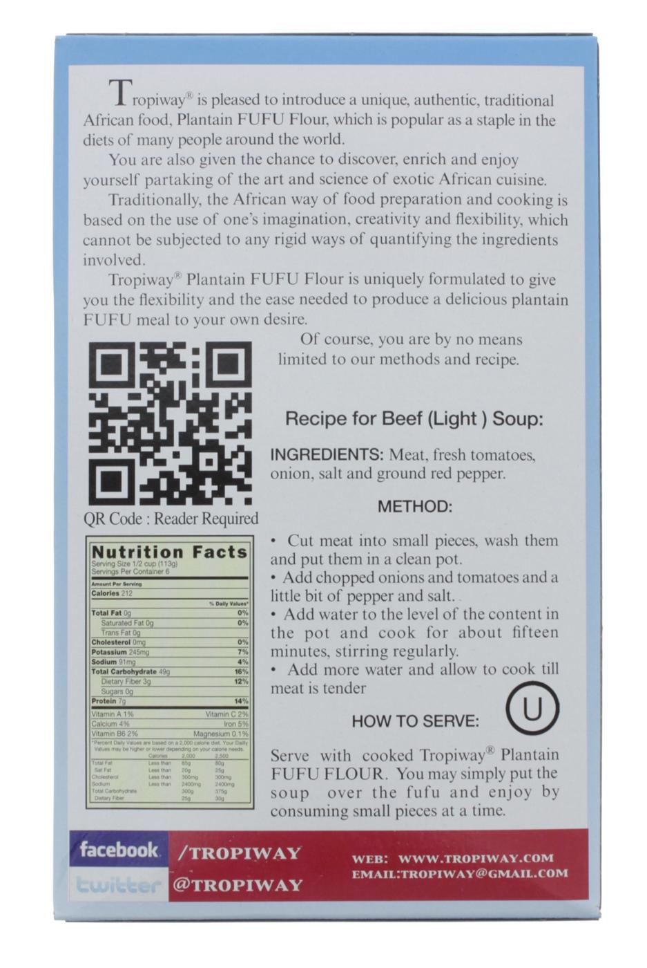Tropiway Plantain Fufu Flour is uniquely formulated to give you the flexibility and the ease needed to produce a delicious FUFU meal as you like it.
