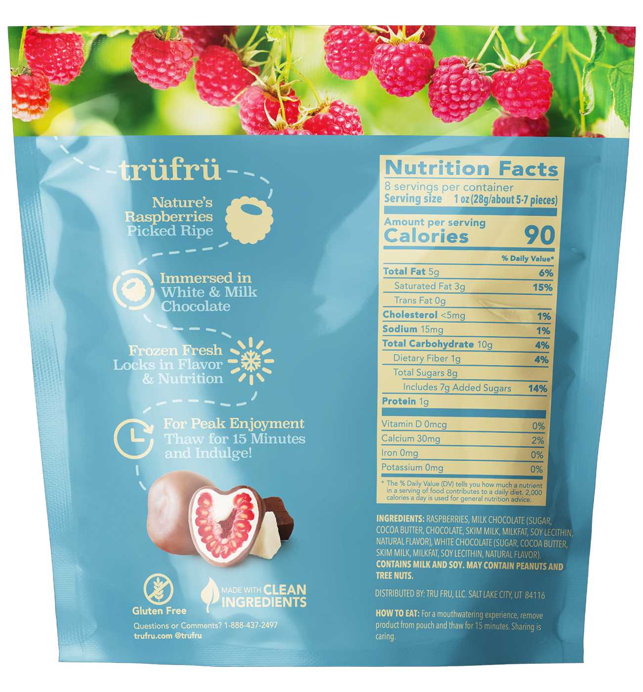 Tru Fru starts with farm fresh raspberries, flash frozen to lock in flavor and nutrients. We dip ripe fruit in smooth milk chocolate and decadent white chocolate for the ultimate frozen chocolate-covered fruit experience. The fruit dessert that lives in your freezer and steals the spotlight at any party. Tru Fru is a frozen novelty TRIPLE THREAT, serving as a late night snack, a gift that says "I have great taste" and the perfect treat-yourself moment. Whether you're hosting a soiree, relaxing at home, or just simply craving something sweet — this is your perfect pairing.