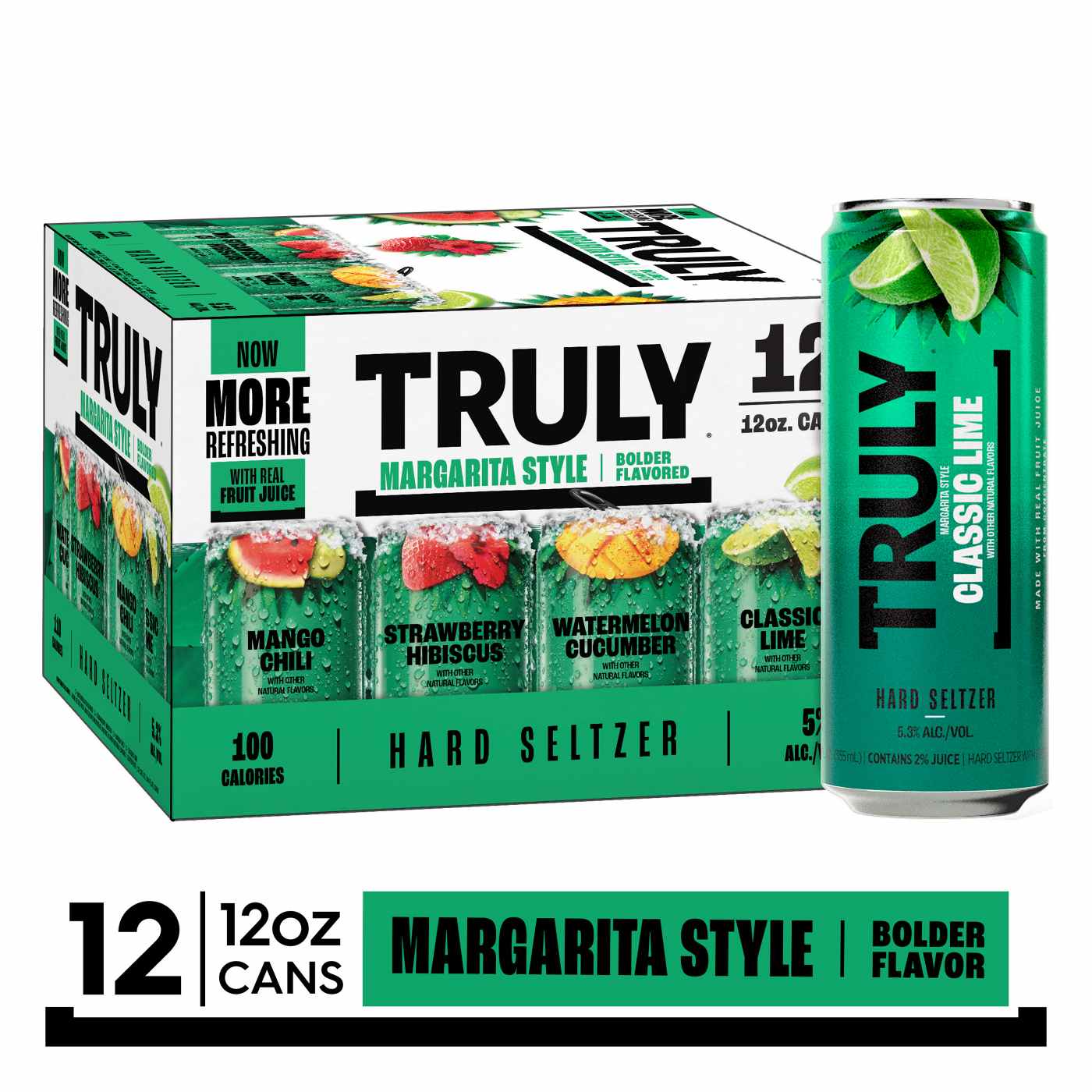 Margarita-inspired flavors paired with the refreshment of Truly hard seltzer - Classic Lime, Strawberry Hibiscus, Watermelon Cucumber and Mango Chili. These hard seltzers are made with real lime juice concentrate, agave nectar and sea salt to deliver a unique mix of sweet, sour, salty and refreshing flavor in every sip. Bring a Truly mix pack to your next tailgate for the win! Now made with real fruit juice, Truly’s best flavors just got even better. With a delicious hint of refreshing flavor and real juice from concentrate to keep you going all game long, there’s a flavor for every play. Whether you’re living it up in the stands or getting fully horizontal on your couch, no Sunday is complete without a case of Truly Hard Seltzer. Each 12oz. can has 110 calories, 5.3% alc./vol. and 1g sugars for refreshment that won’t weigh you down. Mix pack includes three cans of each flavored hard seltzer. Variety 12 pack, 12 fluid ounce cans.