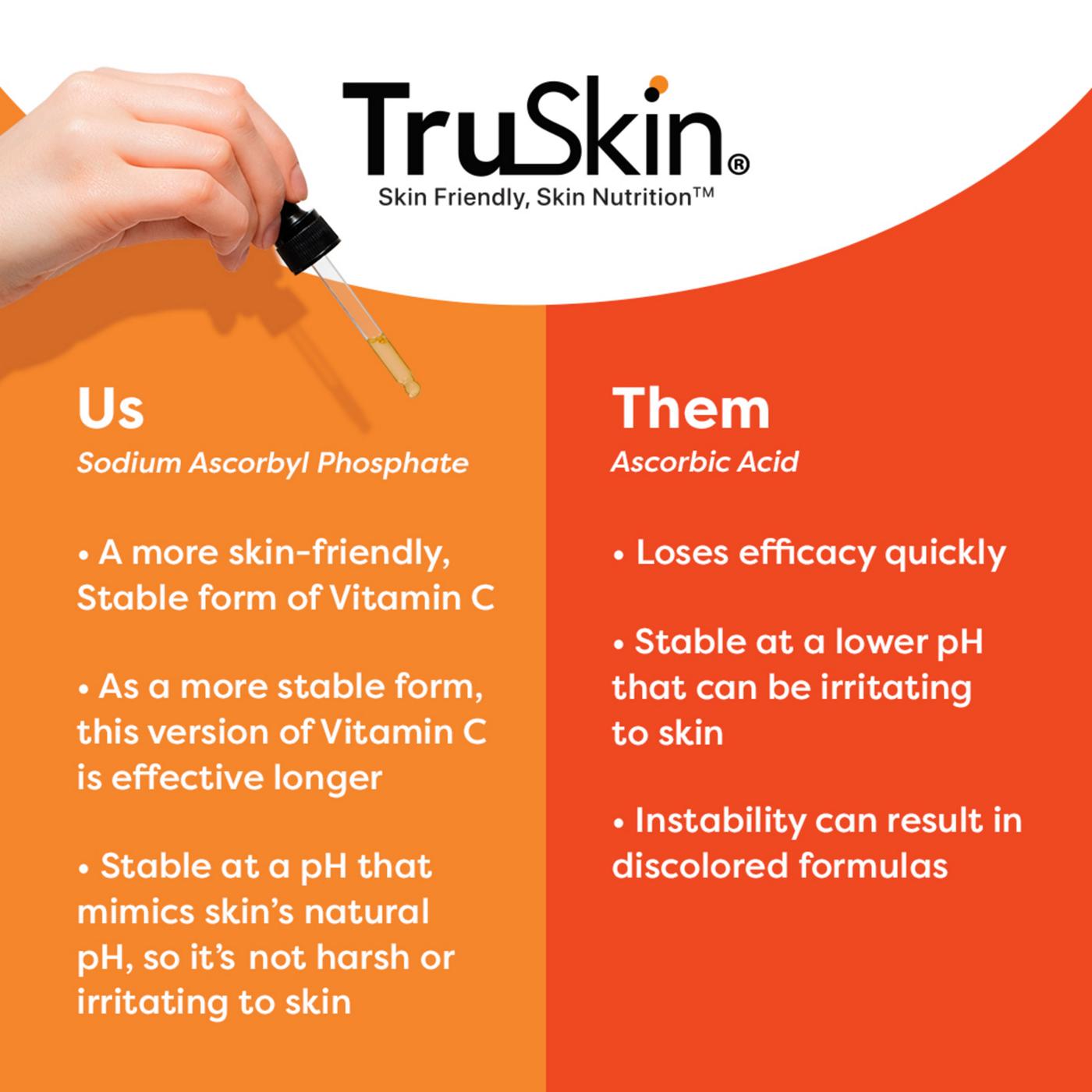 TruSkin's blend features Sodium Ascorbyl Phosphate (SAP), a gentler yet just as effective form of Vitamin C compared to commonly used Ascorbic Acid. SAP is highly stable and mimics skin’s natural pH levels, helping combat irritation. SAP also breaks down slower compared to other forms of Vitamin C, meaning longer-lasting benefits.