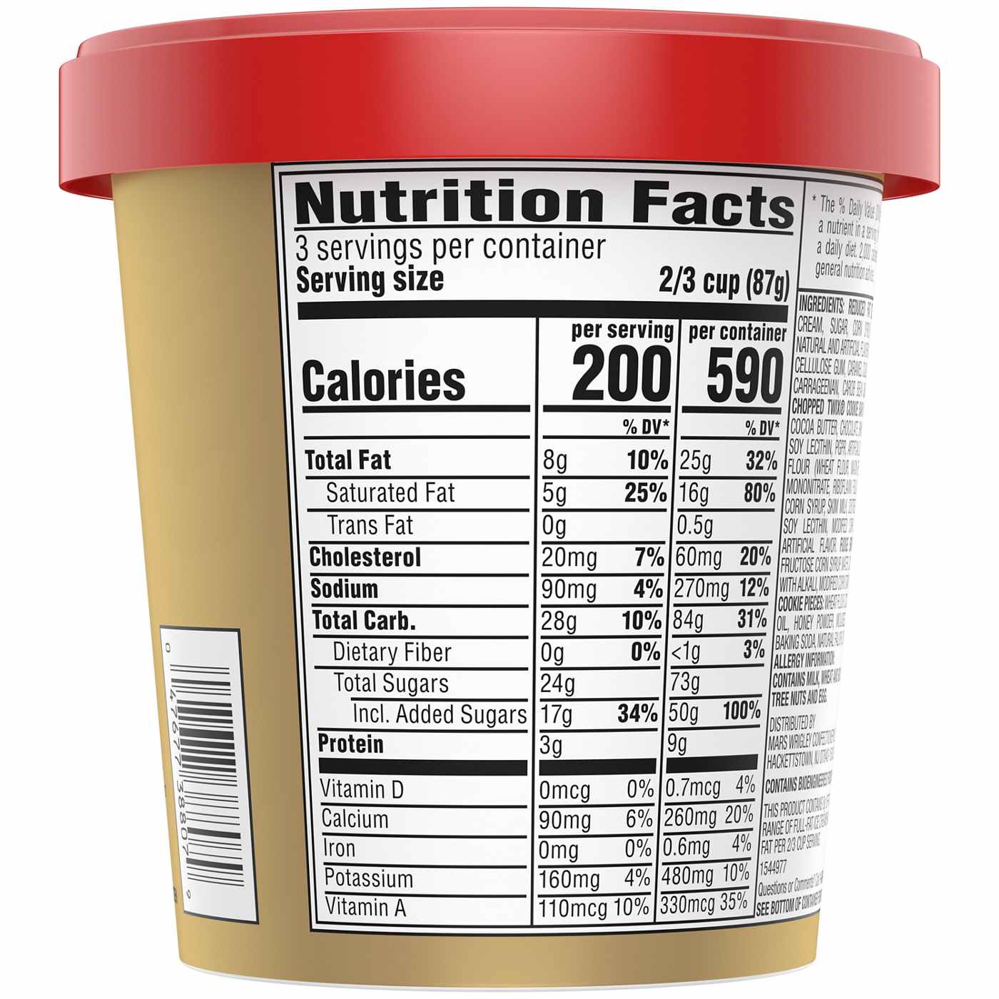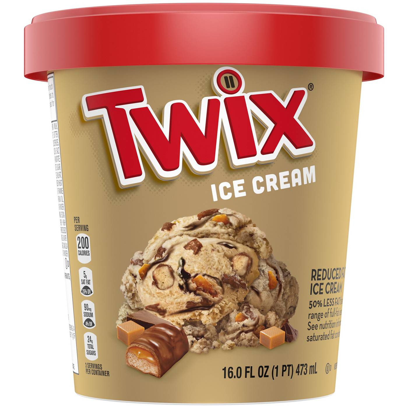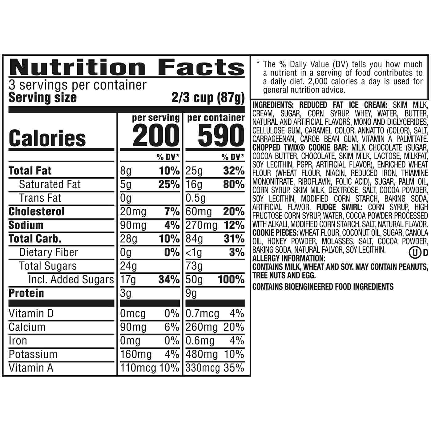 ICE CREAM: MILK, CORN SYRUP, CREAM, SKIM MILK, HIGH FRUCTOSE CORN SYRUP, WHEY, BUTTERMILK, SUGAR, MILKFAT, CAROB BEAN GUM, GUAR GUM, CARRAGEENAN, NATURAL AND ARTIFICIAL FLAVORS, MONO AND DIGLYCERIDES, CARAMEL COLOR, ANNATTO (COLOR), SALT, CELLULOSE GEL, CELLULOSE GUM, POLYSORBATE 80. CHOPPED TWIX®: MILK CHOCOLATE (SUGAR, COCOA BUTTER, CHOCOLATE, SKIM MILK, LACTOSE, MILKFAT, SOY LECITHIN, PGPR, ARTIFICIAL FLAVORS), SUGAR, ENRICHED WHEAT FLOUR (WHEAT FLOUR, NIACIN, REDUCED IRON, THIAMINE MONONITRATE, RIBOFLAVIN, FOLIC ACID), PALM OIL, CORN SYRUP, SKIM MILK, DEXTROSE, FOOD STARCH-MODIFIED, SALT, COCOA POWDER, BAKING SODA, SOY LECITHIN, ARTIFICIAL FLAVOR. CHOCOLATE VARIEGATE: SUGAR, SOYBEAN OIL, COCOA POWDER PROCESSED WITH ALKALI, SKIM MILK, COCONUT OIL, SOY LECITHIN, MONO AND DIGLYCERIDES, SALT. COATED COOKIE PIECES: COOKIE PIECES (WHEAT FLOUR, SUGAR, CANOLA OIL, MALTODEXTRIN, HONEY, BAKING SODA, SOY LECITHIN, SALT, NATURAL AND ARTIFICIAL FLAVOR), COCONUT OIL, COCOA POWDER.Allergens and safety warnings