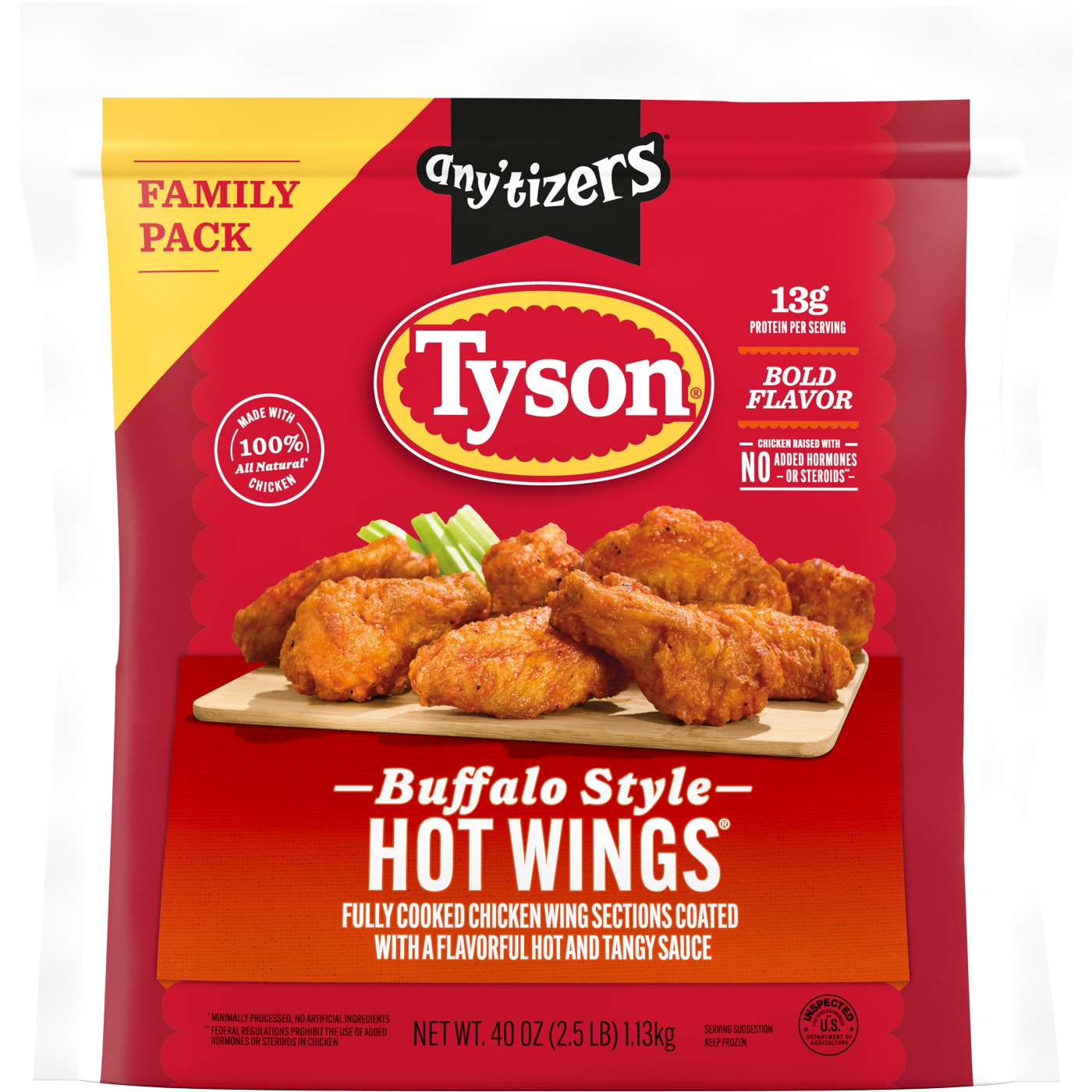 • One 2.5 lb Tyson Any'tizers Frozen Buffalo Style Hot Wings Family Pack.